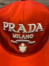 Authentic Prada Milano hat in a bold red and white colorway. Crafted from Prada’s signature lightweight nylon material, giving it that sleek designer-sport aesthetic the brand is known for.