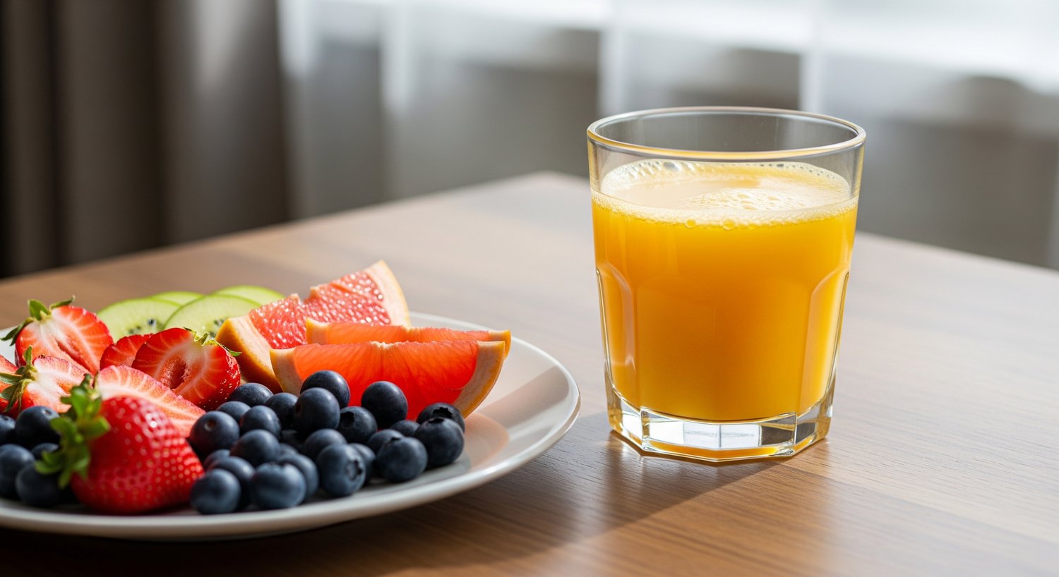 Fresh fruit plate with blueberries, strawberries, grapefruit, and kiwi next to a glass of orange juice on a wooden table, bright morning light.