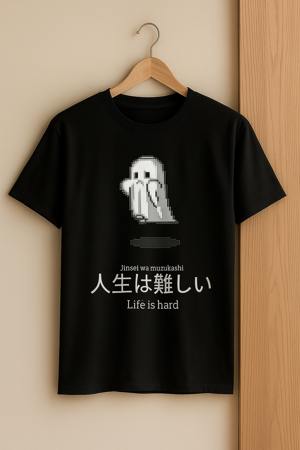 Featuring the phrase “人生は難しい” (Life is Hard) in Japanese, this tee blends anime streetwear, sadcore vibes, and retro pixel art. Perfect for those who love minimalistic fashion, K-pop & J-pop aesthetic, vaporwave, dark academia or just want to make a deep statement with their outfit.