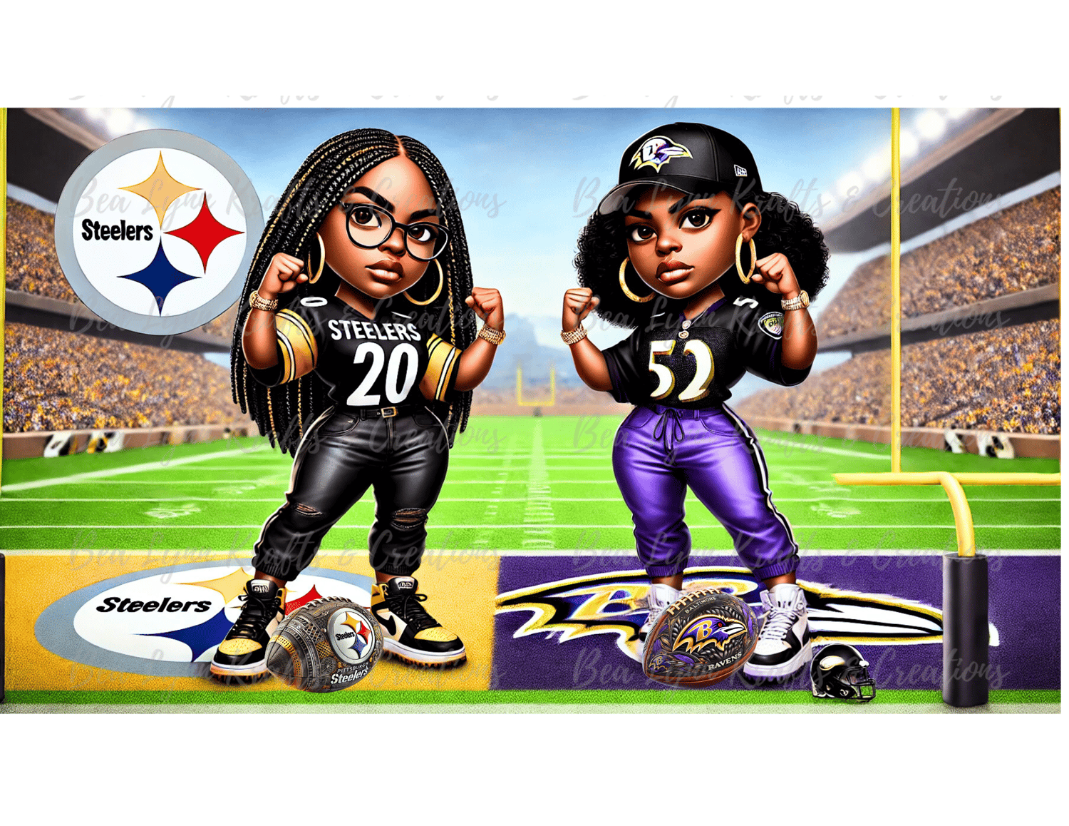 Get ready to bring the energy of game day to your creations with this dynamic sports fan illustration! This image features two competitive and spirited fans—a Pittsburgh Steelers fan with iconic braids and a Baltimore Ravens fan—fully dressed in their team colors and jerseys. The scene is packed with game-time intensity, as both characters face off on a football field, exuding determination and team pride. Perfect for any football enthusiast looking to capture the spirit of the rivalry!