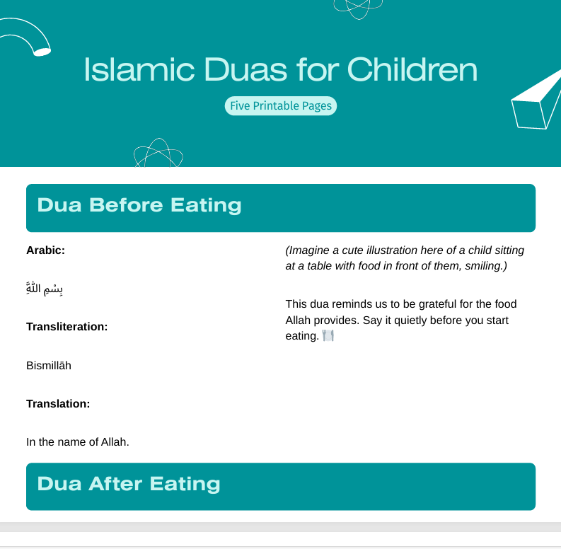 - Daily Duas for Kids – Simple duas with Arabic text, transliteration, and English translation