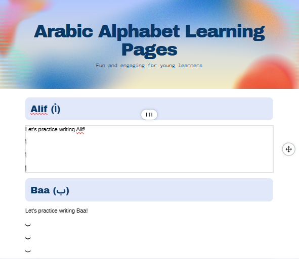 - Arabic Alphabet – Learn all 28 Arabic letters with pronunciation, names, and cute illustrations