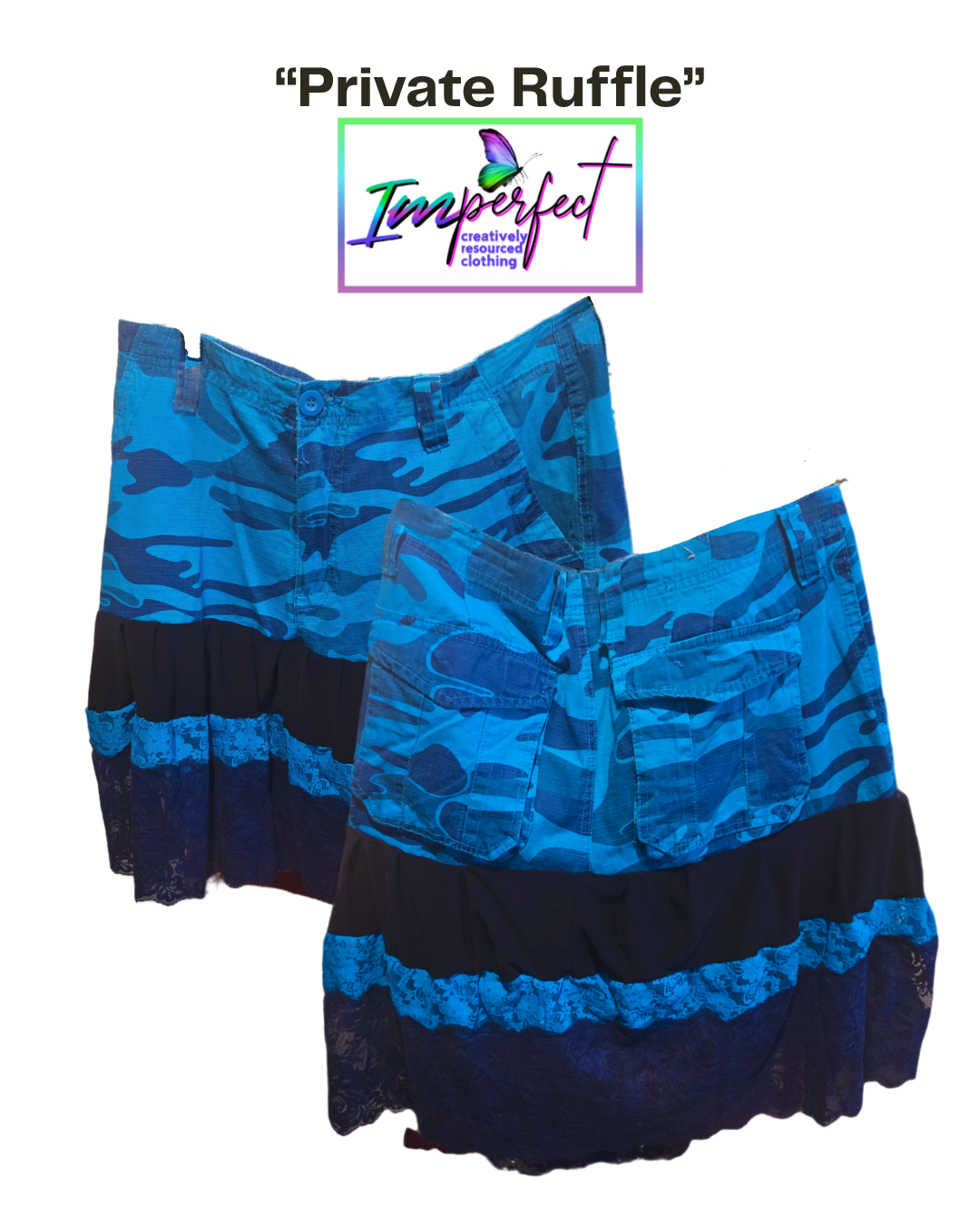Camo gets girly. This reimagined skirt flips the script with frills, lace, and a whole lotta fun. It’s military remix meets flirty misfit—perfect for marching to your own beat - preferably in boots and "going Mach 2 with your hair on fire." (Anyone know that movie quote?)