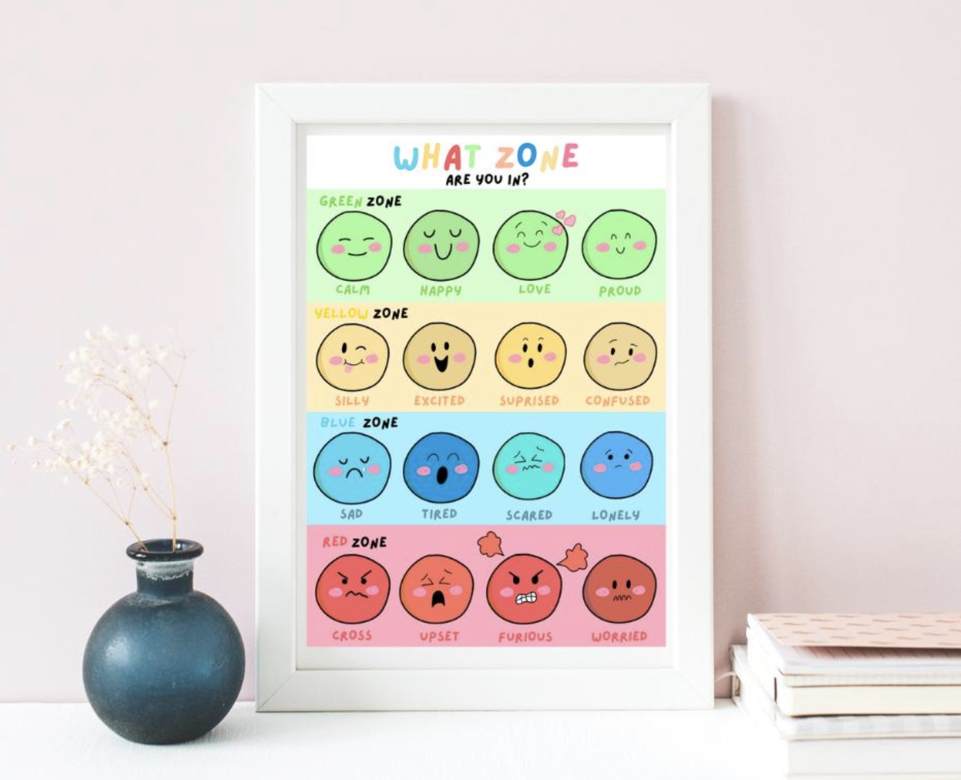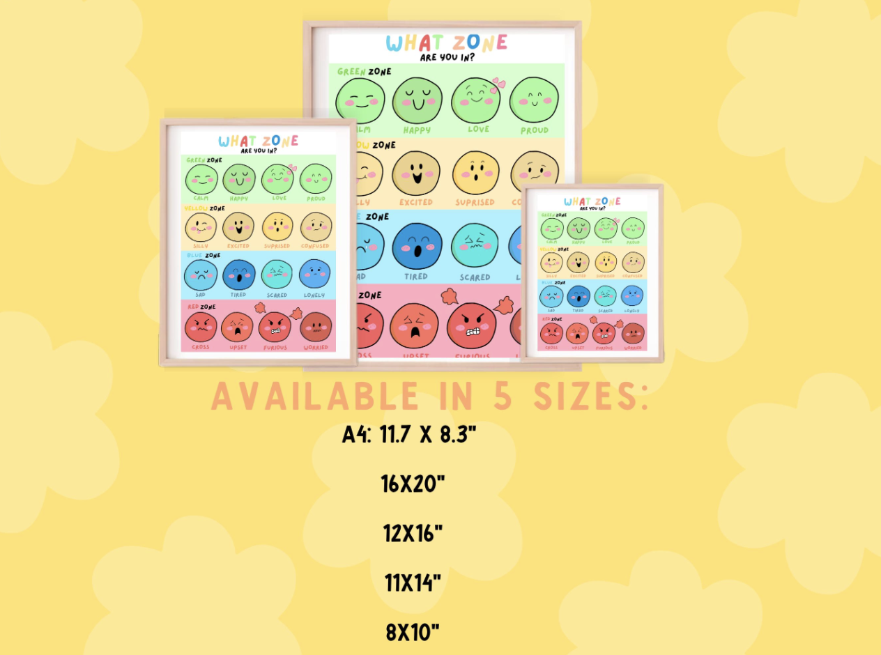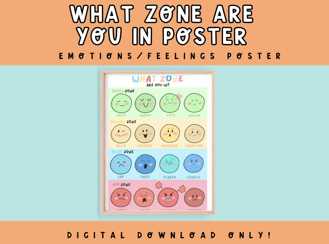 What zone are you in? Emotions chart for Kids - Digital Download/ Zones of regulation poster for emotional awareness. classroom wall art.