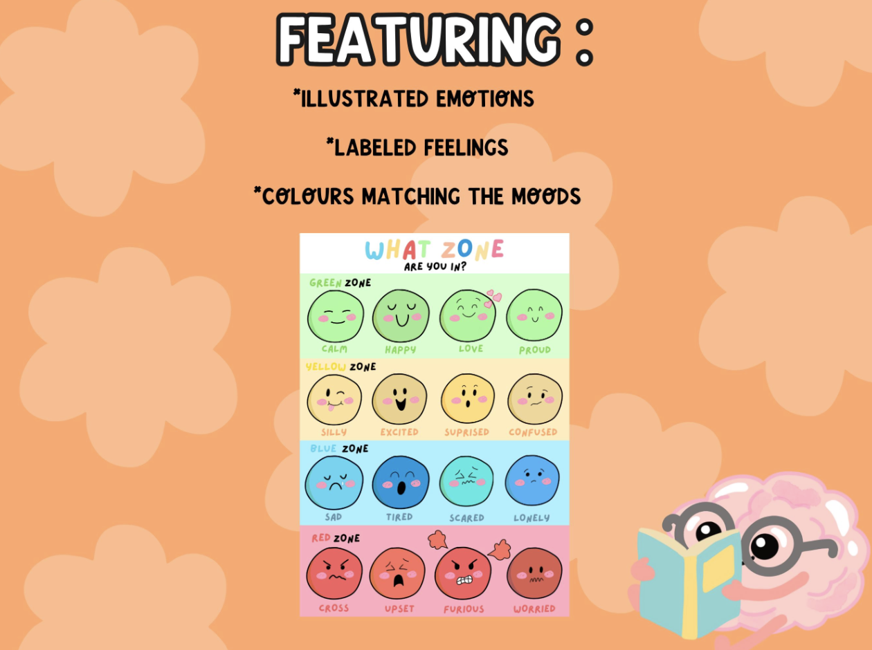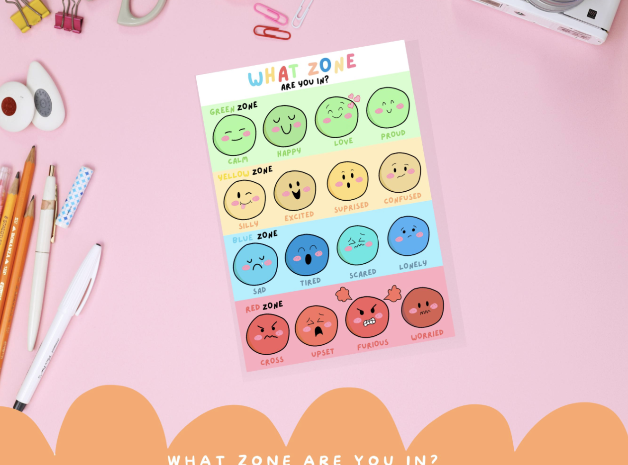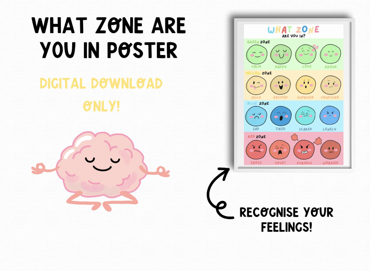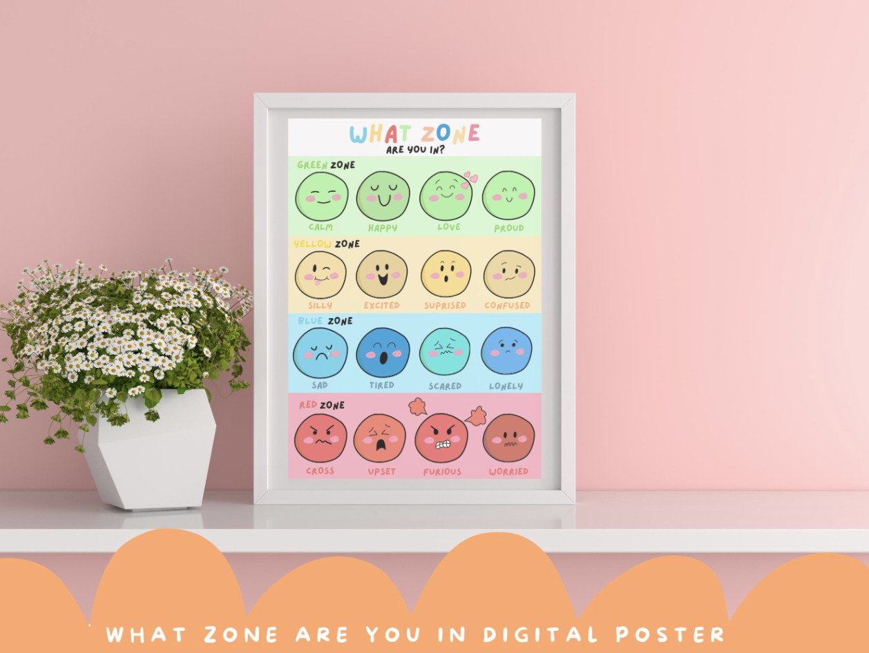 Help children identify and understand their feelings with this "What Zone are you in?" emotions chart! This colourful and interactive digital poster uses Zones of regulation framework to teach children how to recognise and manage their emotions in a healthy way.