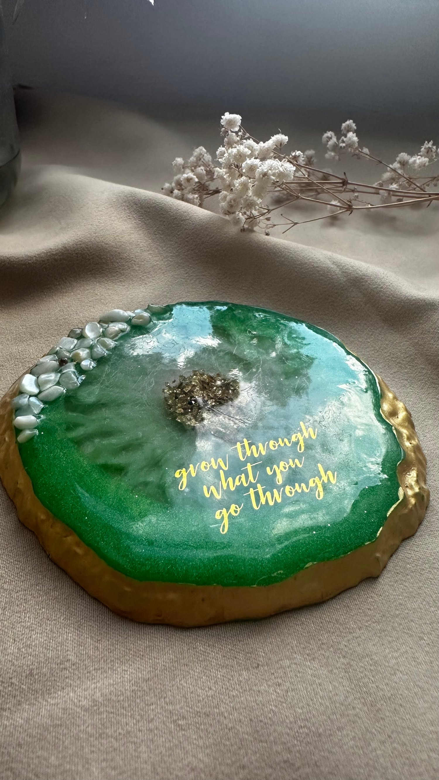 A unique handmade epoxy resin coaster with a diameter of 10 cm. Adorned with natural stones, gold accents, and an inspiring inscription: “Grow through what you go through.” Its distinctive design and refined finish make it not only a stylish interior detail but also a functional accessory for your home.