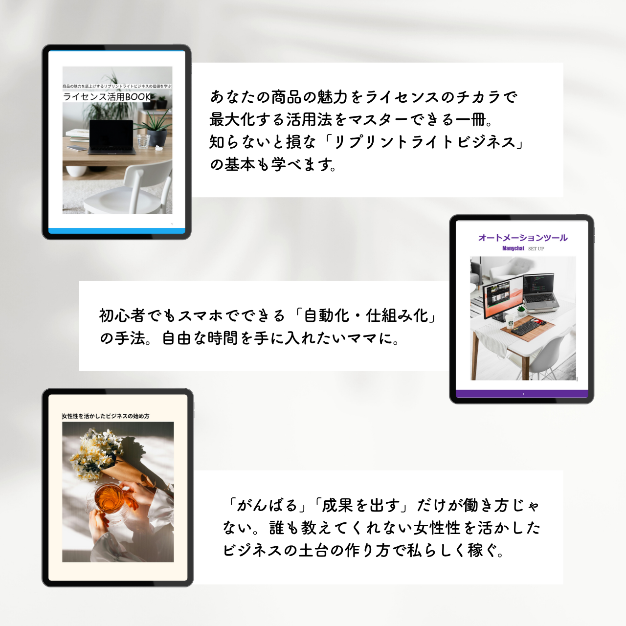 このコンプリートパックがあれば、再販売可能なデジタルコンテンツの知識・ツール・商品だけでなく販売の仕組みまで全てがそろい、今日からあなたも販売スタートできます。