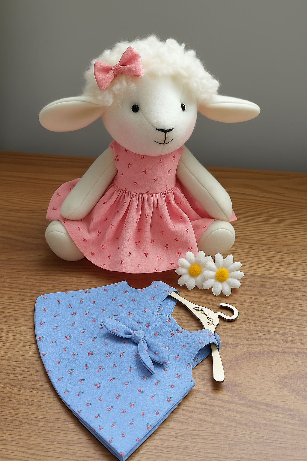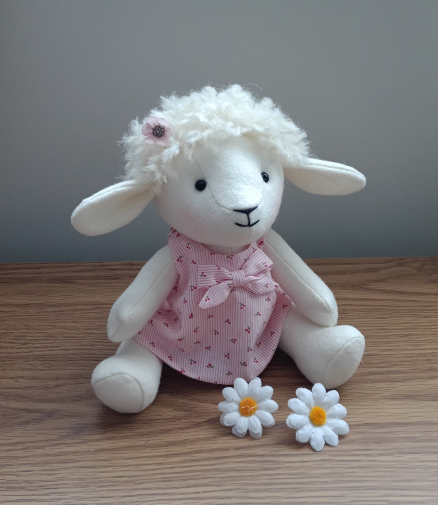 Geraldine is a pretty little lamb that stand 10 inch tall, she wears a pretty dress that is included in the pattern and is easy to make, she is made here in a wool mix felt but could be made in any fabric.