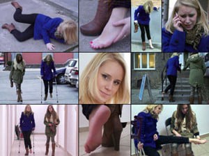 Hannaluara was on the back of a Harley when she spun out, broke two bones and got her cast. Now she's hobbling around in a flip flop and crutches and wiggling her pretty long toes. The next day she is in shorts and a sneaker crutching around in her angled LLC thrusting out in front of her with each long stride. The cast is pretty itchy by now and she stops often to prop her stiff leg up, dip her fingers into the front of her cast to scratch her long exposed toes. Some very nice closeups of this attractive lady.