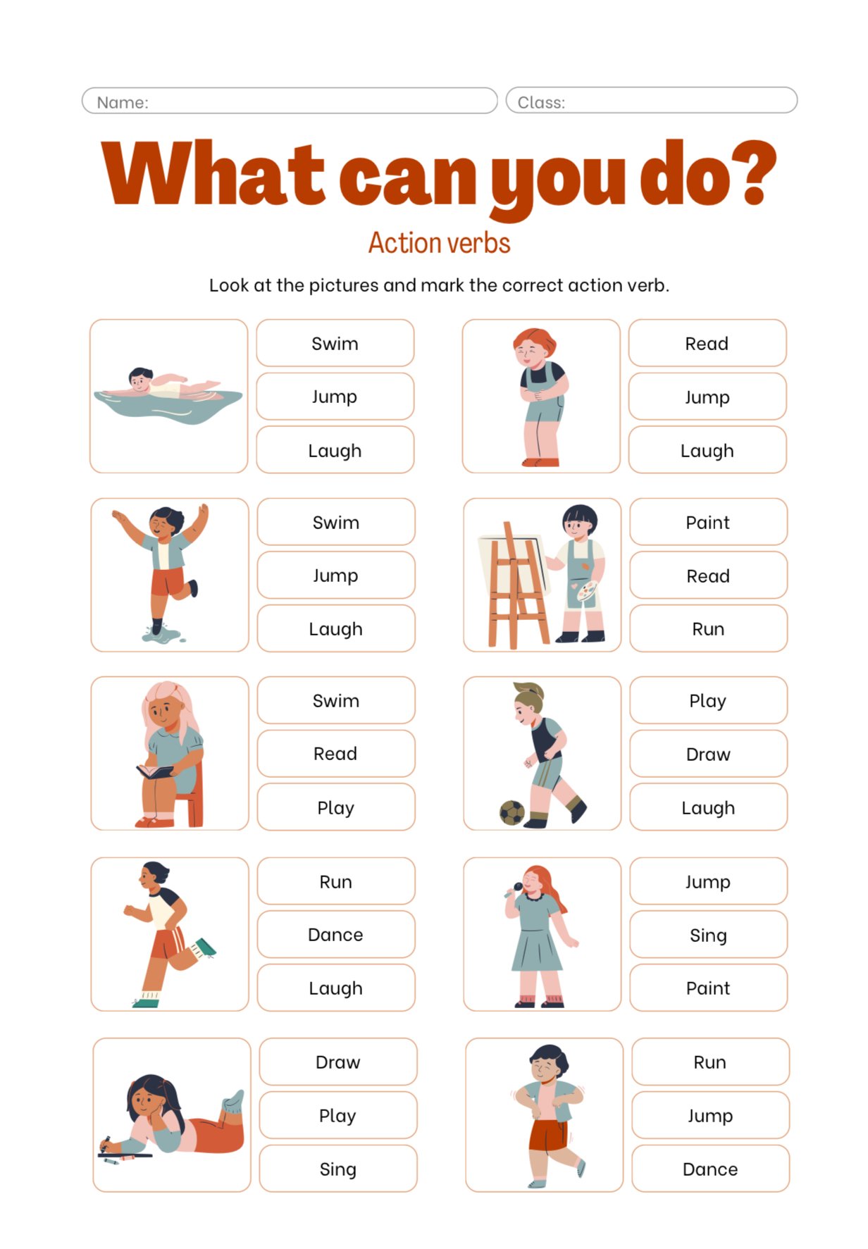 Orange White Illustrative Action Verbs Worksheet