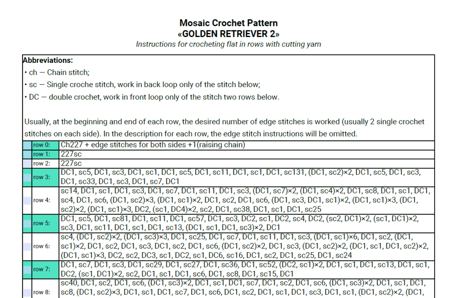 - Written pattern, row by row in PDF