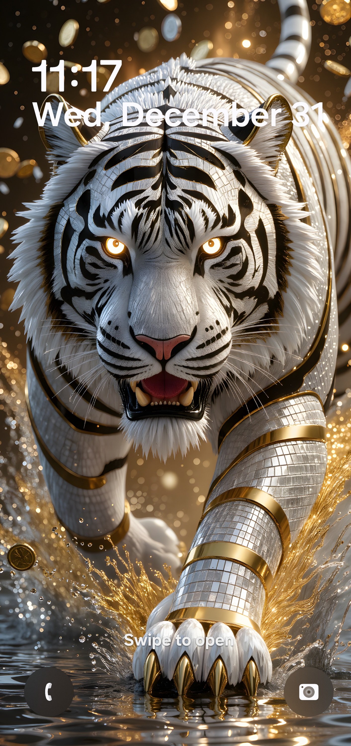 This ultra-luxury live wallpaper features a majestic white tiger forged from diamond-like armor and gold accents, striding forward through shimmering water as golden coins cascade around it. Subtle animated motion—gentle stalking movement, flowing water ripples, and refined light shimmer—brings the scene to life while remaining smooth, elegant, and loop-friendly for daily use.