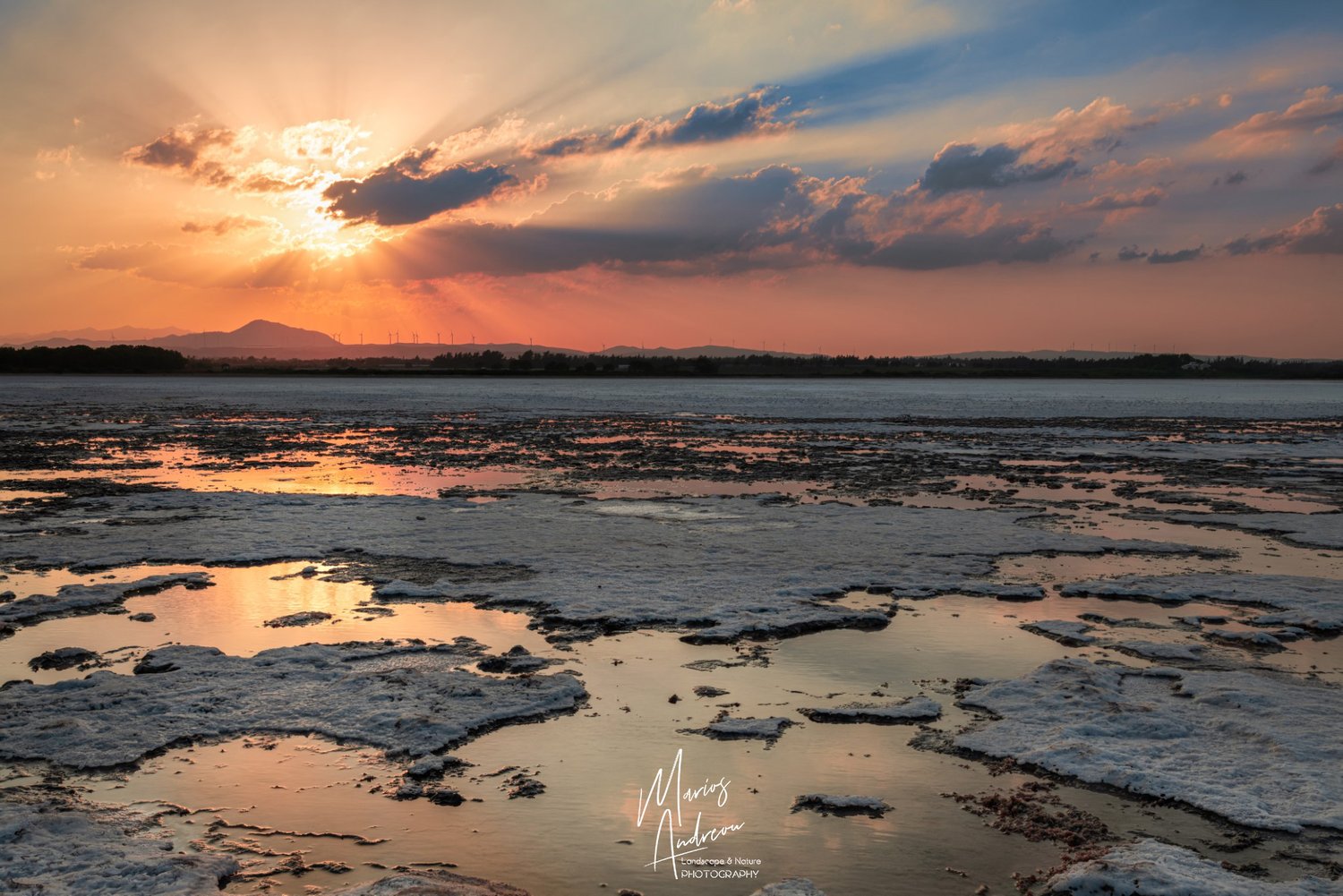 Immerse yourself in the tranquil beauty of nature with this breathtaking sunset over the Larnaca Salt Lake in Cyprus. As the golden rays of the setting sun break through scattered clouds, they paint the sky with rich hues of orange, pink, and blue. The glistening salt formations in the foreground reflect the warm light, creating a serene and otherworldly landscape.