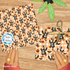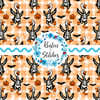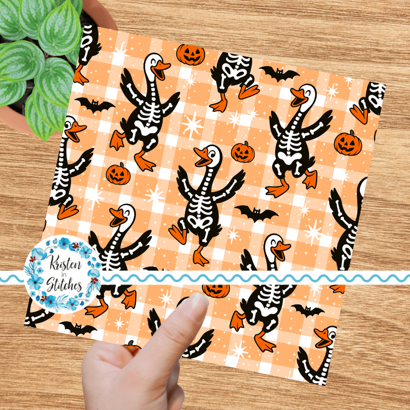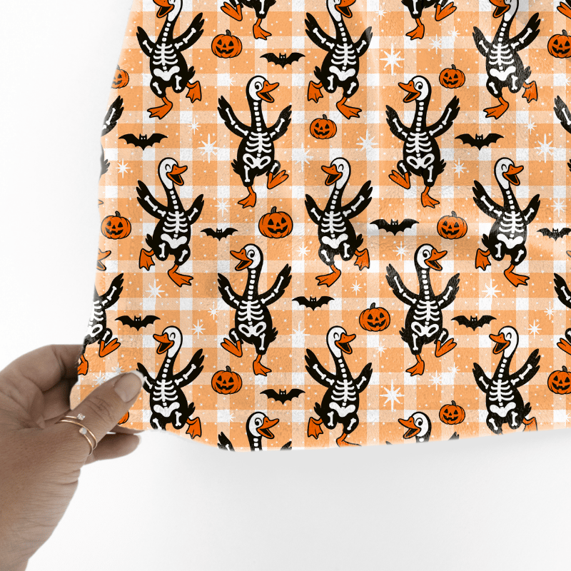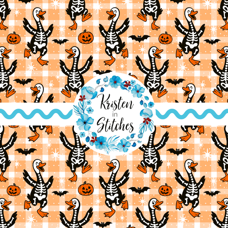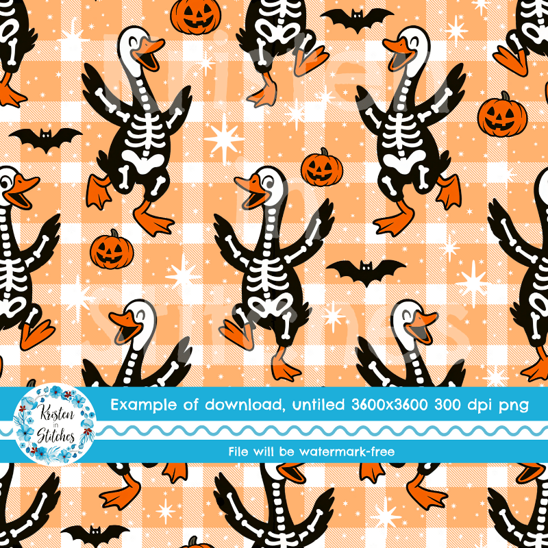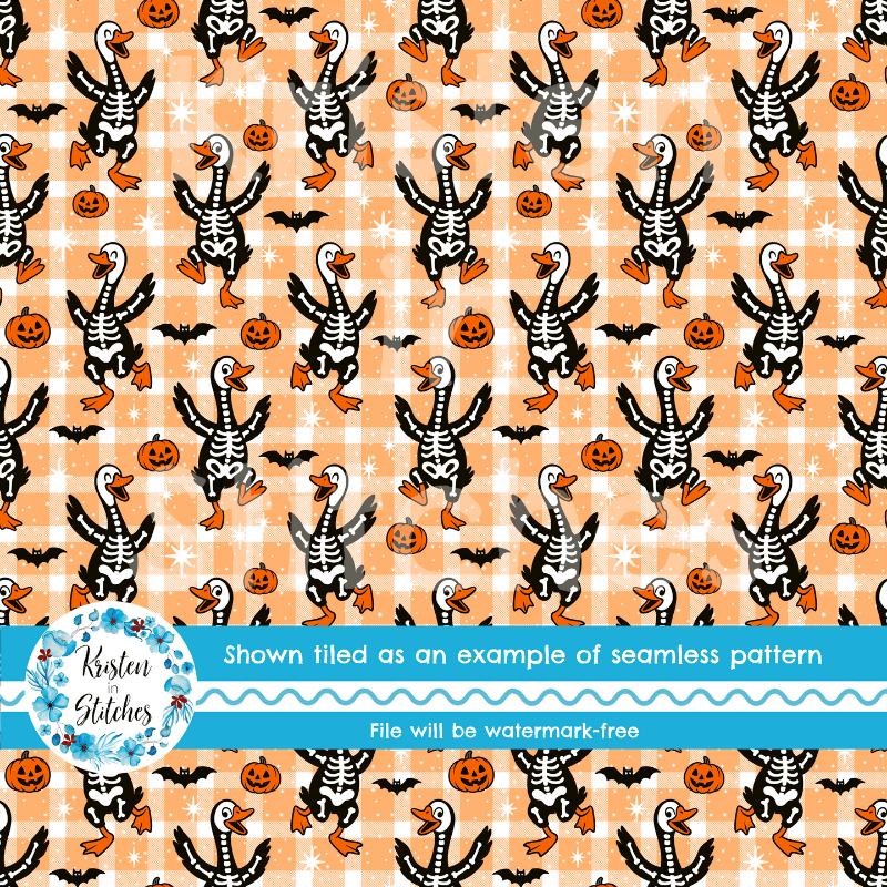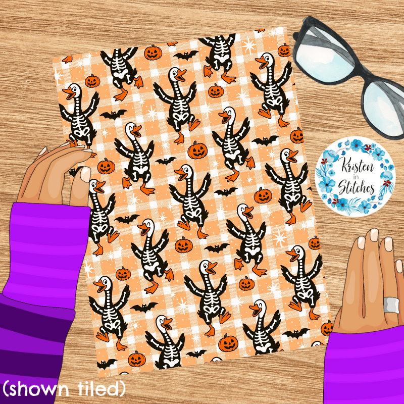 Silly geese dressed up as skeletons for halloween and trick or treating, on orange gingham plaid.