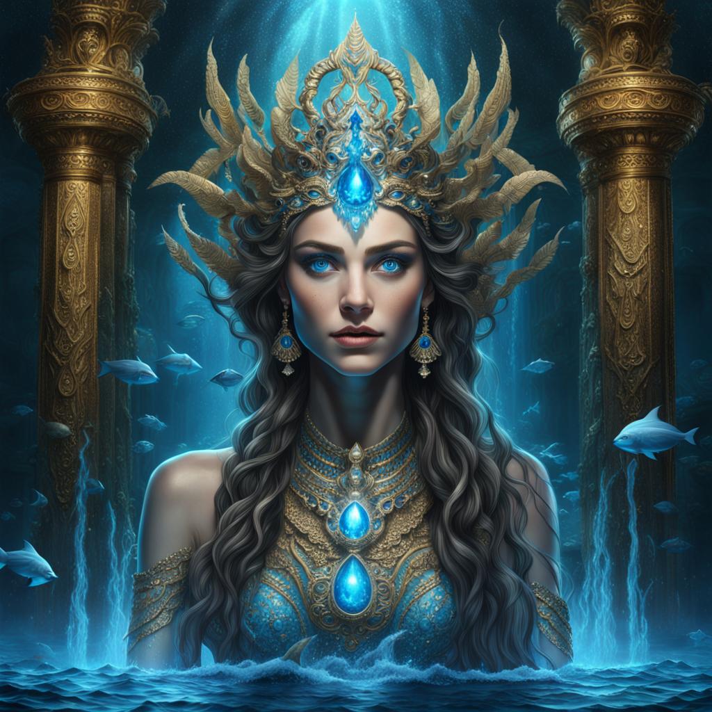 Product Description: Dive into the enchanting depths with the "Majestic Water Sorceress Queen," a photorealistic digital portrait capturing the serene gaze and commanding presence of a sorceress queen within the mystical Water Temple. With shimmering blue eyes and regal attire, she exudes majesty and tranquil power.