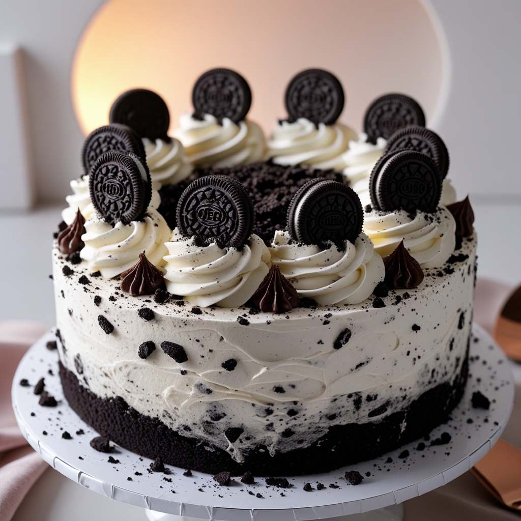 A decadent cookies and cream cake with Oreo-style toppings, generous cream swirls, and rich chocolate crumbs, showcased in a modern dessert aesthetic, set against a clean and minimalist background, with soft, warm lighting accentuating the moist texture and vibrant colors of the cake, the cream swirls are smooth and velvety, the chocolate crumbs are dark and chunky, and the Oreo-style toppings are perfectly rounded and spaced, the overall style is sleek and contemporary, with a focus on showcasing the intricate details and textures of the cake.