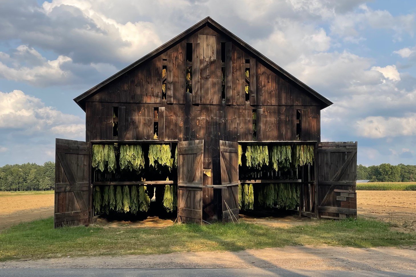 Meadow Street captures a seasonal scene in the Pioneer Valley with an end view of a Tobacco Shed shortly after harvest with doors open showing tobacco hanging.