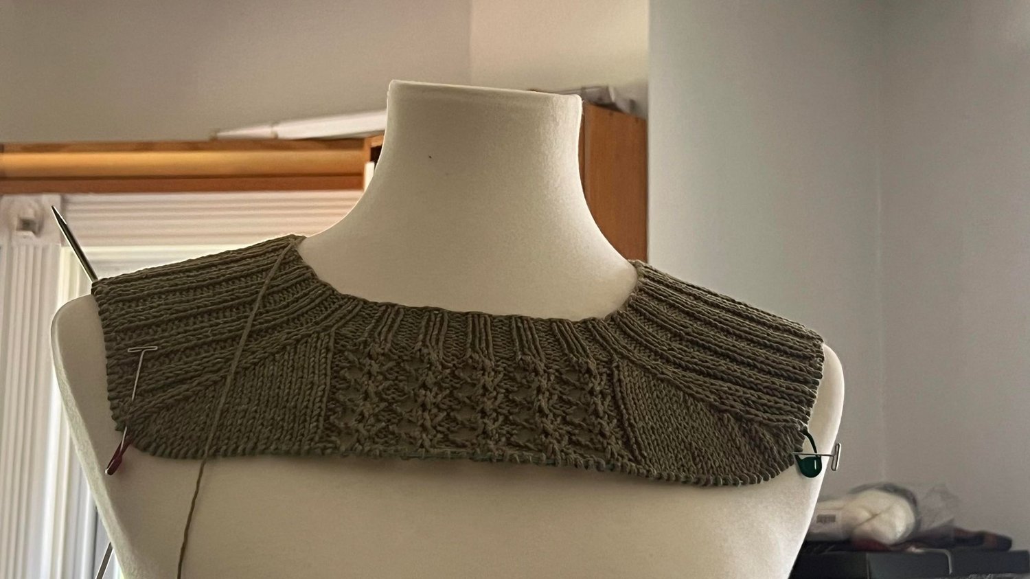 Knit seamlessly from the top down and in the round, AWA features an eye-catching lace panel on the front, set against smooth stockinette. The shoulder shaping is unexpected and refined, elevating the entire silhouette. It’s the kind of piece that pairs just as easily with jeans as it does with a flowing skirt.