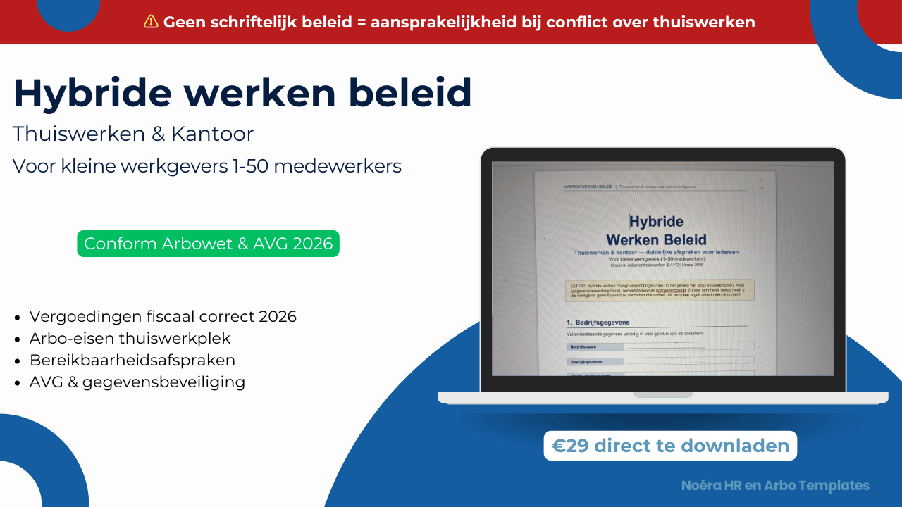 Ontwikkeld door een senior HR- en arbo-adviseur met meer dan 20 jaar praktijkervaring. Gebaseerd op de actuele Arbeidsomstandighedenwet, AVG en fiscale thuiswerkregels 2026. Specifiek ontworpen voor werkgevers zonder eigen HR-afdeling.