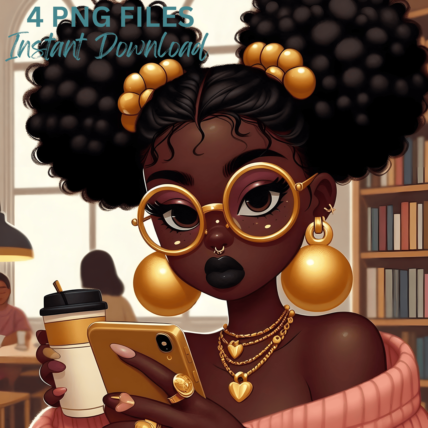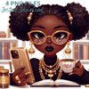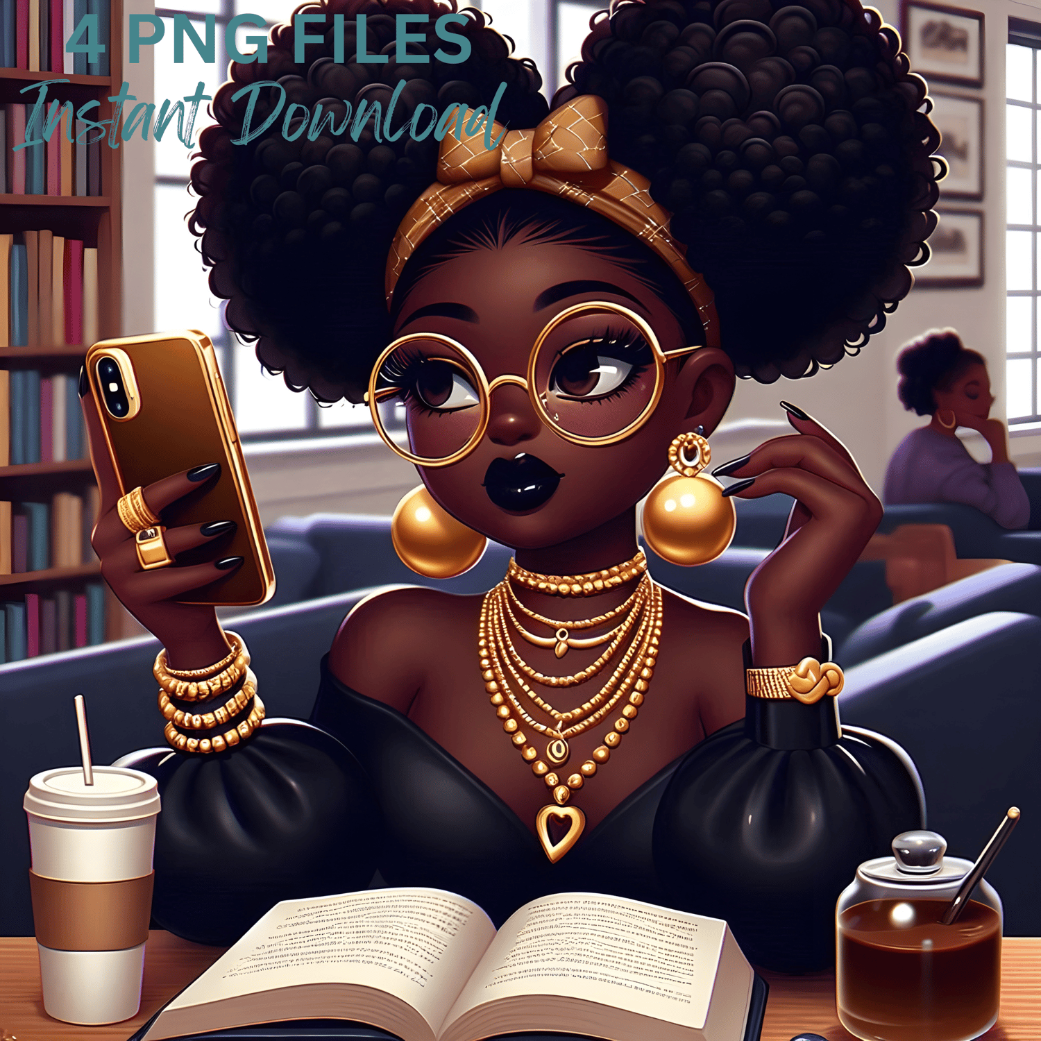 Celebrate beauty, brains, and Black girl magic with this stunning 4-piece PNG clipart set featuring beautiful melanin-rich women in a cozy library setting. Perfect for any project that calls for intelligence, empowerment, and style—from planners and digital journals to book-themed merch and educational content.