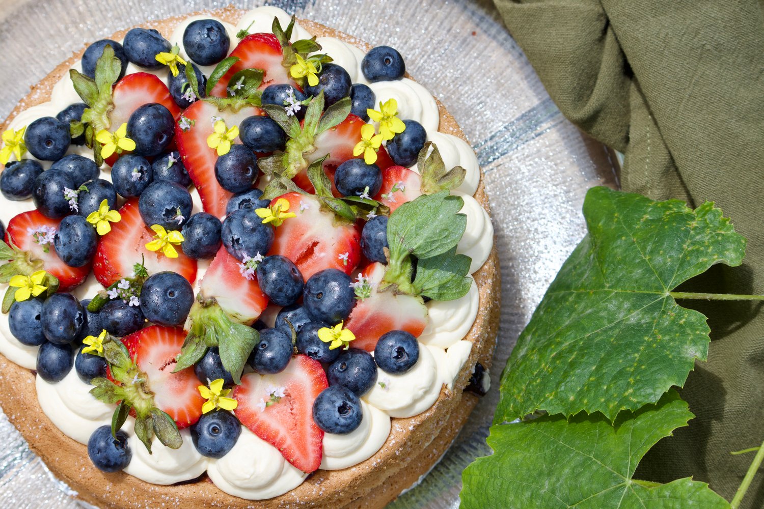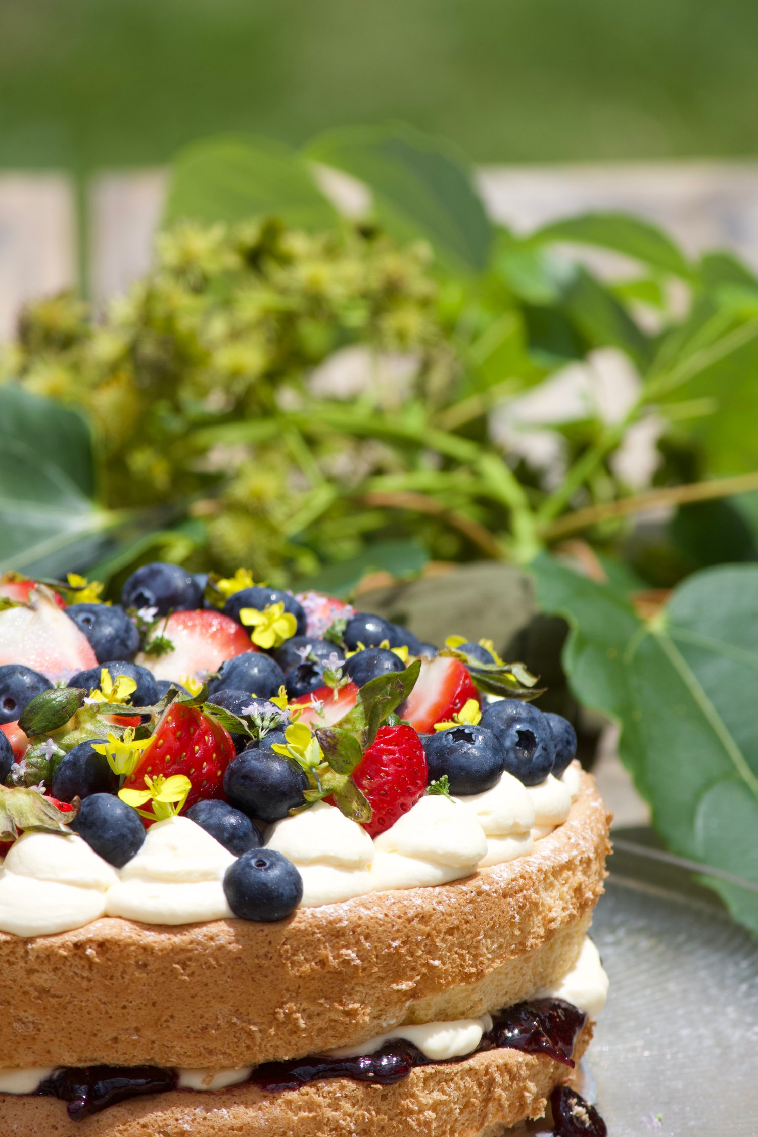 This classic victoria sponge consists of our sky-high sponge, creme légère, and sticky toffee berry jam, topped with seasonal fruit and edible flowers.