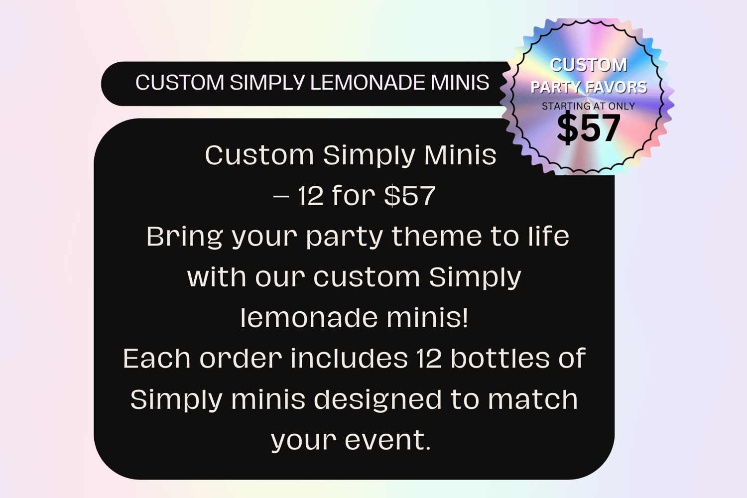 Add the perfect touch of glam to your event with our custom-designed simply lemonade minis! Each order includes 12 personalized simply lemonade minis for $57, created to match your theme and make your party unforgettable. See the magic for yourself! Party Favor Magic