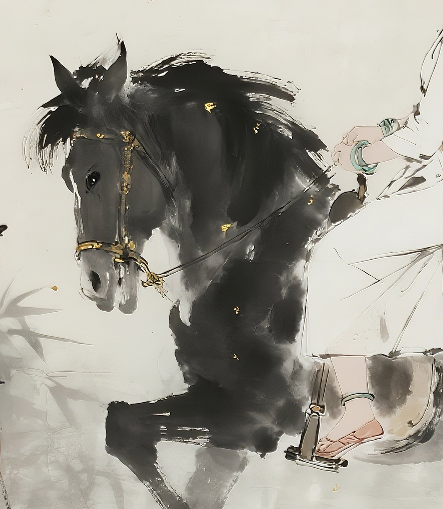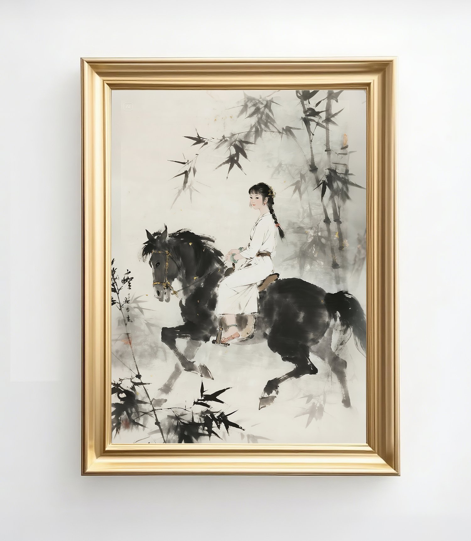The woman’s calm and graceful expression, combined with the dynamic posture of the horse and the subtle movement of the bamboo, creates a refined balance between stillness and motion.