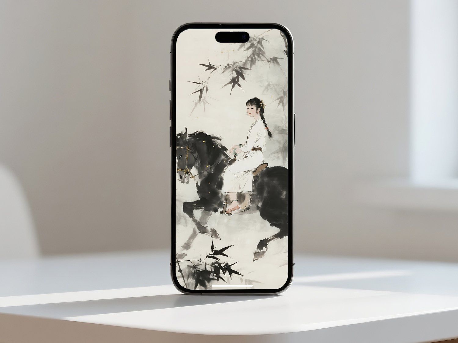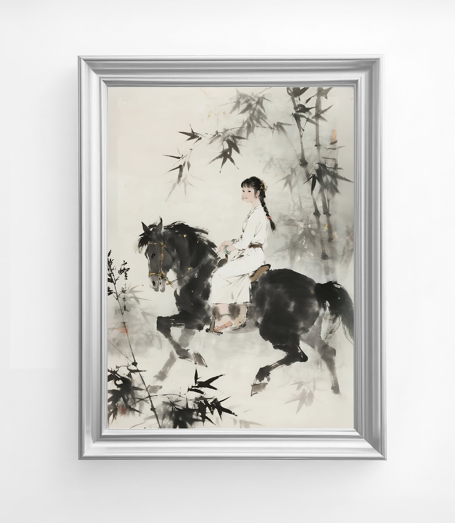 The central placement of the woman on horseback immediately draws the eye, while the bamboo background provides depth and tranquility. The contrast between the woman’s white attire and the dark horse enhances the overall balance and harmony of the piece.
