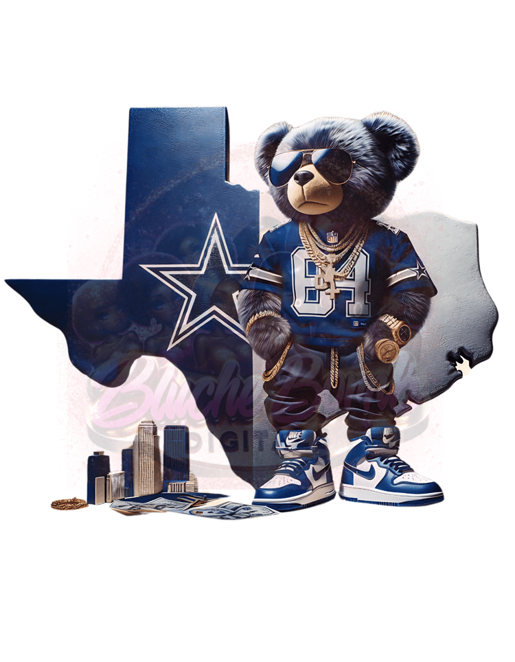 This bold and trendy Dallas Cowboys teddy bear digital design is perfect for die-hard fans! Featuring a cool teddy bear in Cowboys gear, complete with sneakers, a hoodie, and gold accessories, this design is perfect for T-shirts, mugs, tumblers, and more. Whether you're crafting game-day gear or custom gifts, this unique graphic will be a hit among Cowboys fans everywhere!