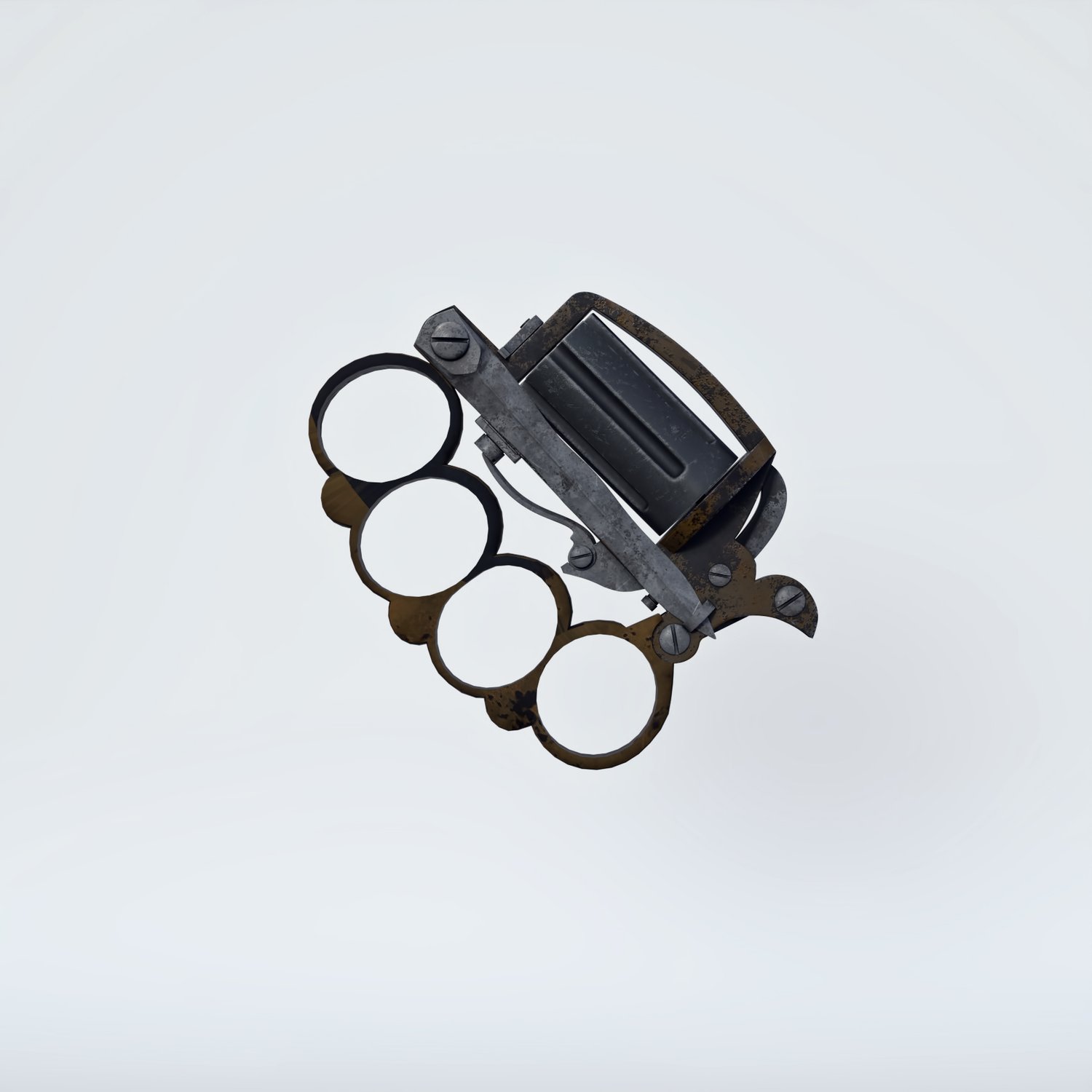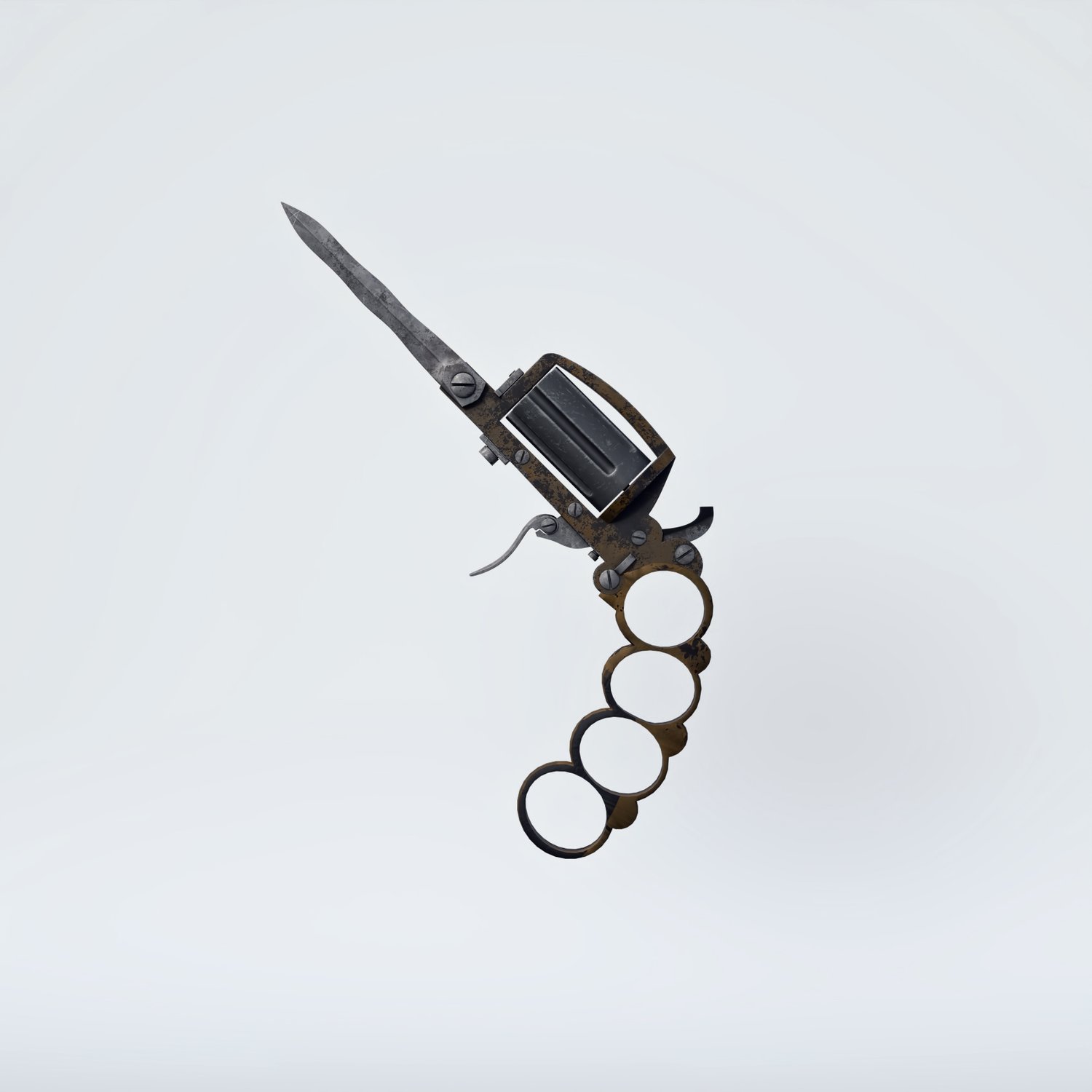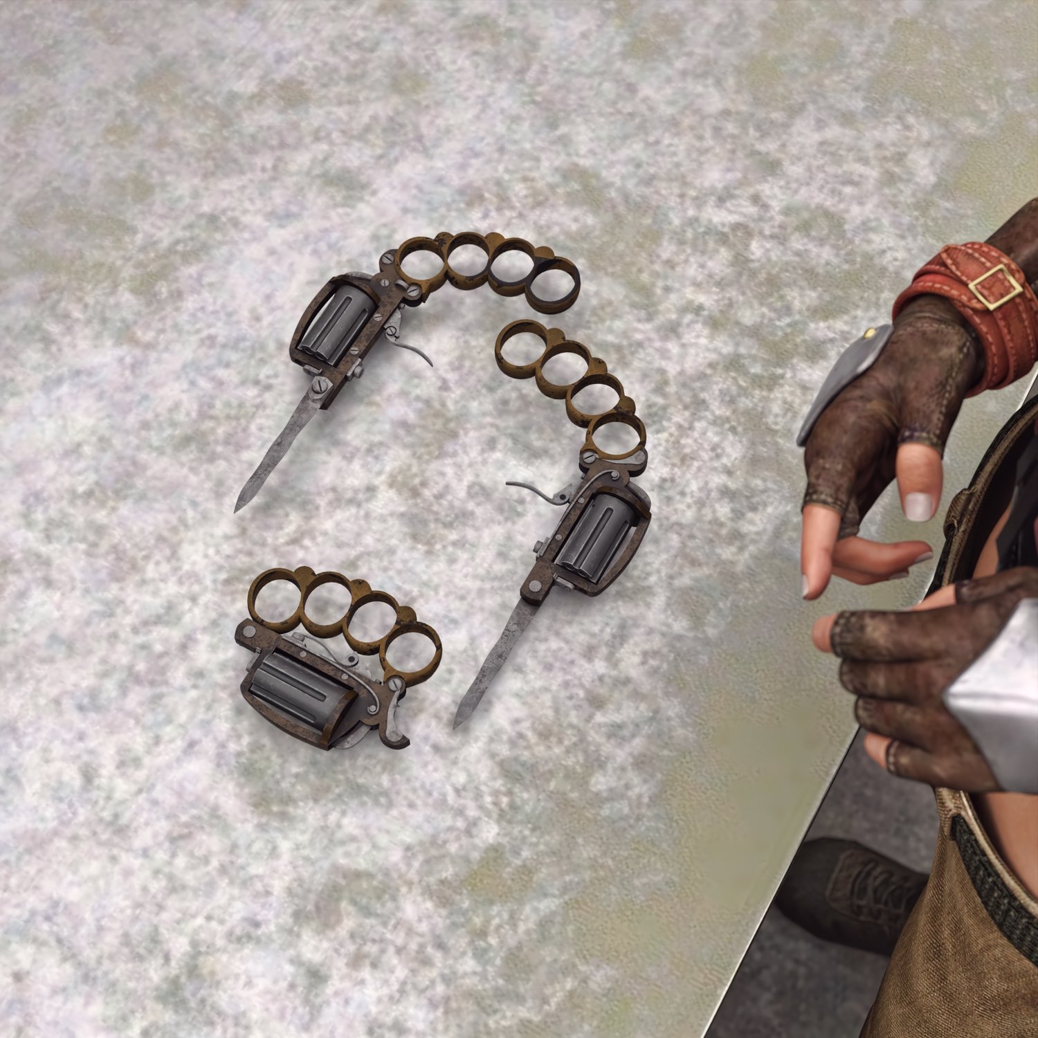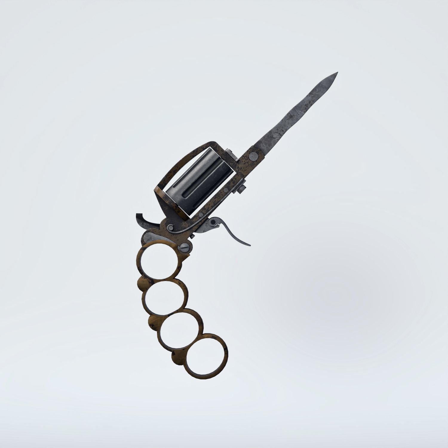 A handgun which incorporates multiple other weapons, made notorious by the French underworld figures of the early 1900s. Designed and produced at the end of 19th century. Cool looking gun, great for concealment. If there are no bullets- you can still punch with it. The prop is rigged and converted for use with DAZ. Trigger, knife, etc also rigged for more realistic pictures. The gun can fold to a knuckle form or a gun form. The knife is also rigged.