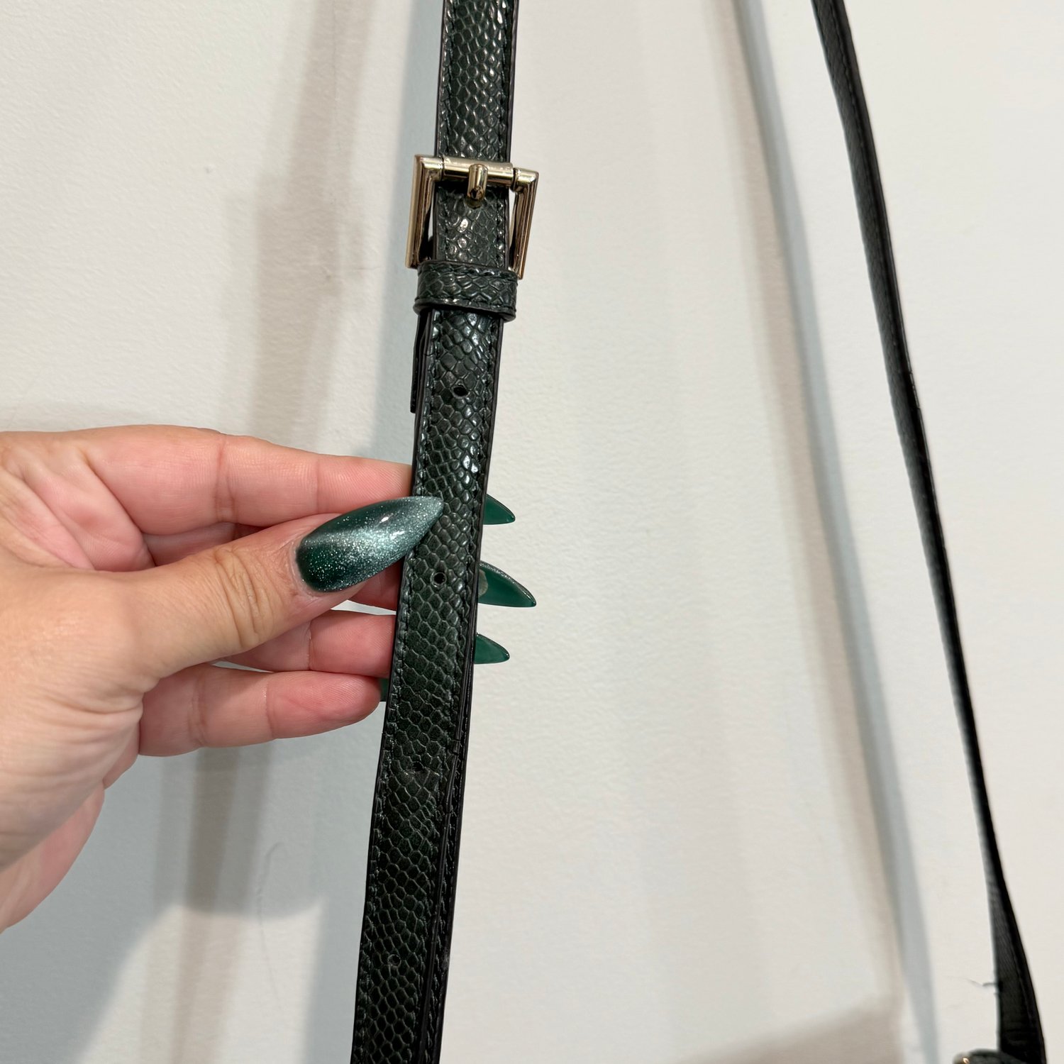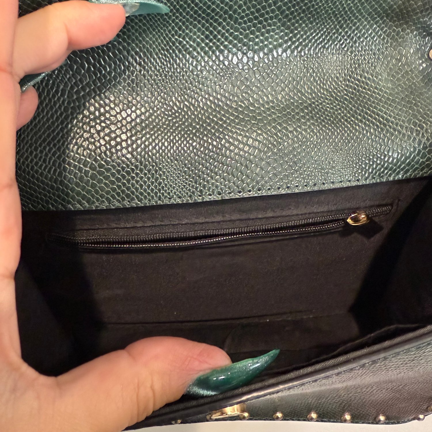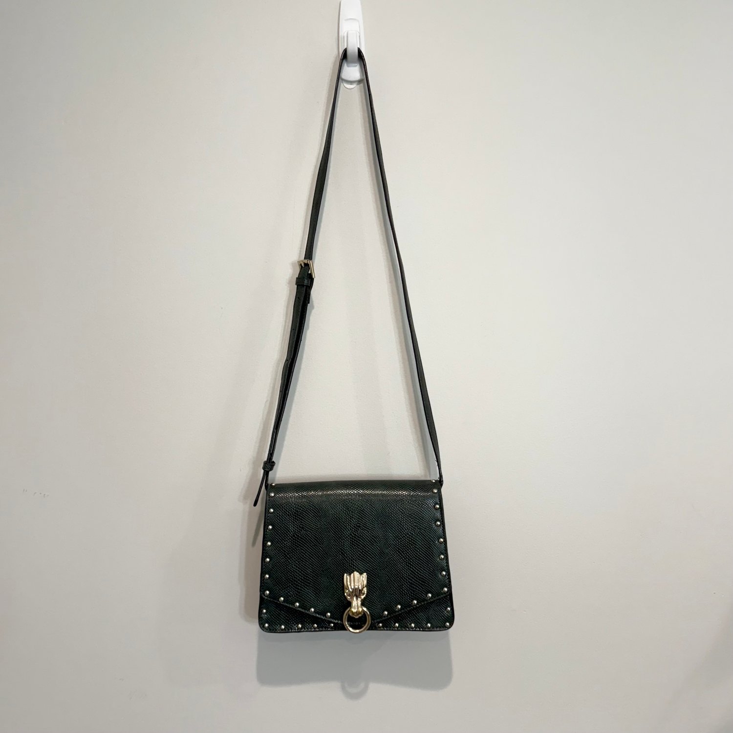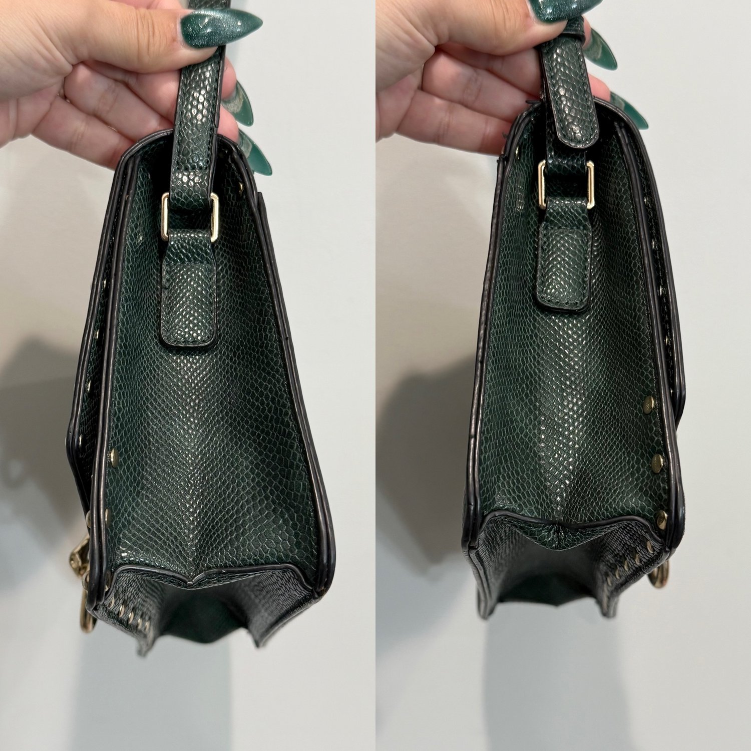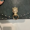 Unbranded dark green snake embossed faux leather bag with gold tone metal hardware, studs and a Dragon door knocker emblem. This bag is slightly structured and can be worn as a longer shoulder bag or crossbody. The strap is adjustable but not removable. The flap has a magnet snap closure to the one inside compartment which has a zippered pocket along one wall and a slip pocket along the other wall.