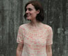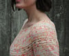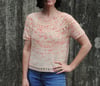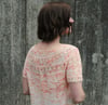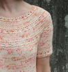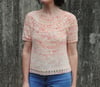 This garment is worked top-down, in the round. Open textures are created throughout most of the yoke using Lateral Braids, yarn overs, dropped stitches and a seed stitch pattern. Once the yoke is completed, stitches are separated into body and sleeves, both of which are also worked top-down, in the round. The body starts by working short row shaping into the back of the tee, with the short row turns hidden along the underarm cast on stitches. The body is worked in stockinette, with a textured waistband that follows the same patterns as the yoke. The sleeves are short and worked in the same style as the body: stockinette followed by a textured knit cuff.