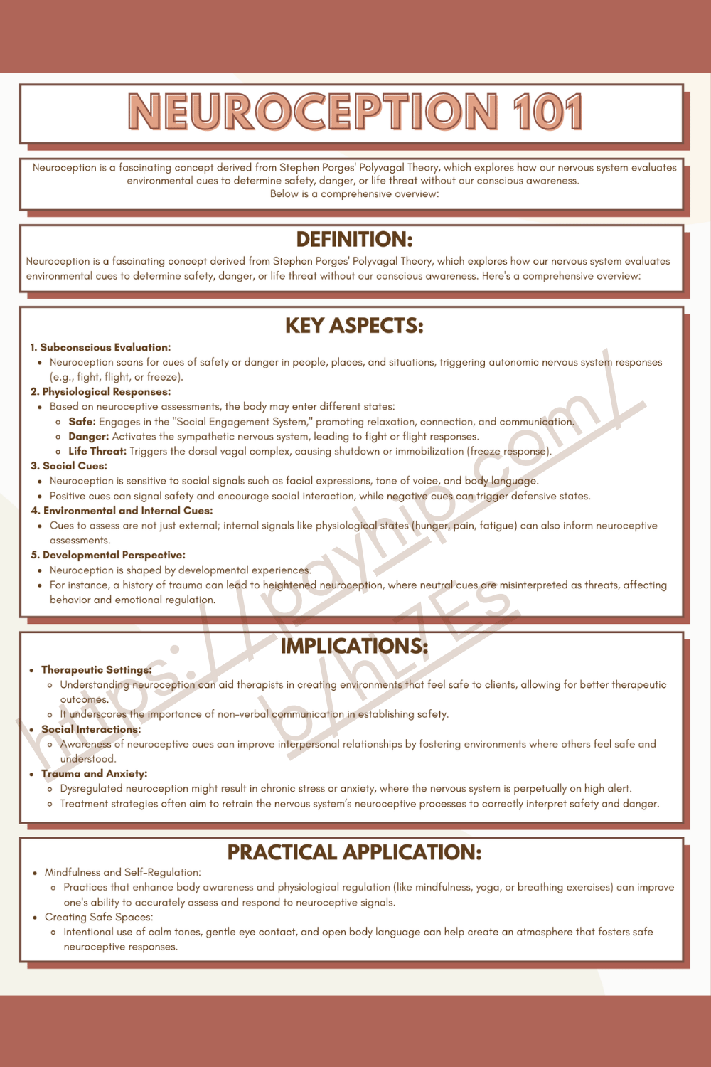 Neuroception is a fascinating concept derived from Stephen Porges' Polyvagal Theory, which explores how our nervous system evaluates environmental cues to determine safety, danger, or life threat without our conscious awareness. This worksheet offers a comprehensive overview of neuroception.