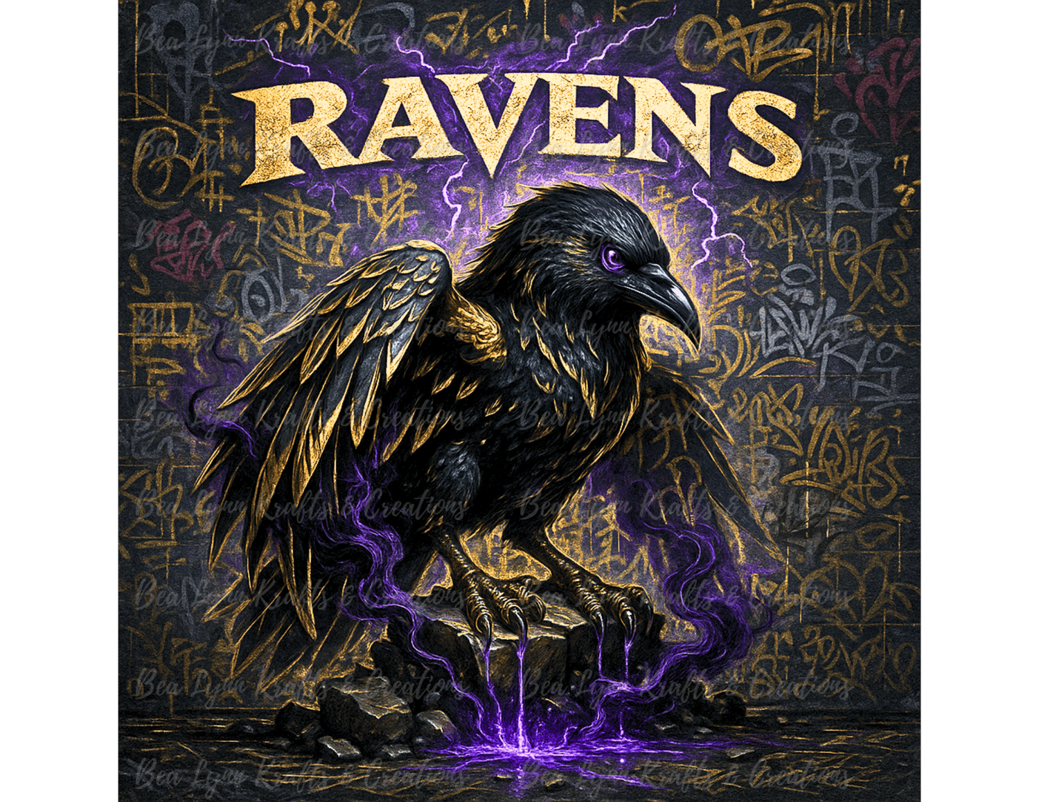 - 💥 “RAVENS” headline in metallic gold for maximum impact