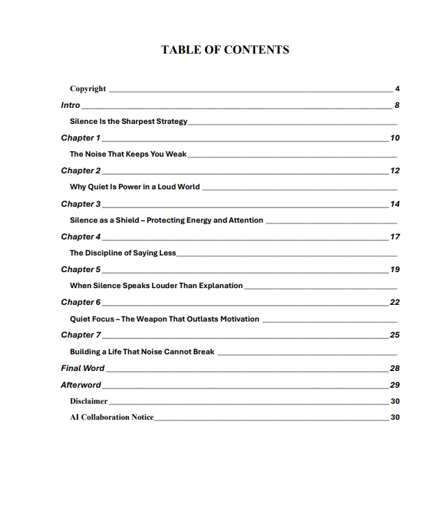 Silence Is the Sharpest Strategy is a concentrated manifesto on presence, discipline, and the power of restraint. J.D. Veyne shows how silence is not absence, but leverage: a shield for your energy, a weapon for your focus, and a discipline that outlasts noise every time.