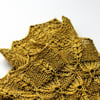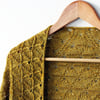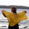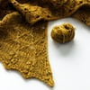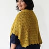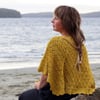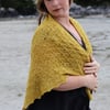 This half-hexagon shawl features a triangular textured motif reminiscent of a pine cone. The bottom edge uses an elongated stitch pattern to create graceful scallops, while the wingspan showcases a neat i-cord trim for a polished finish.