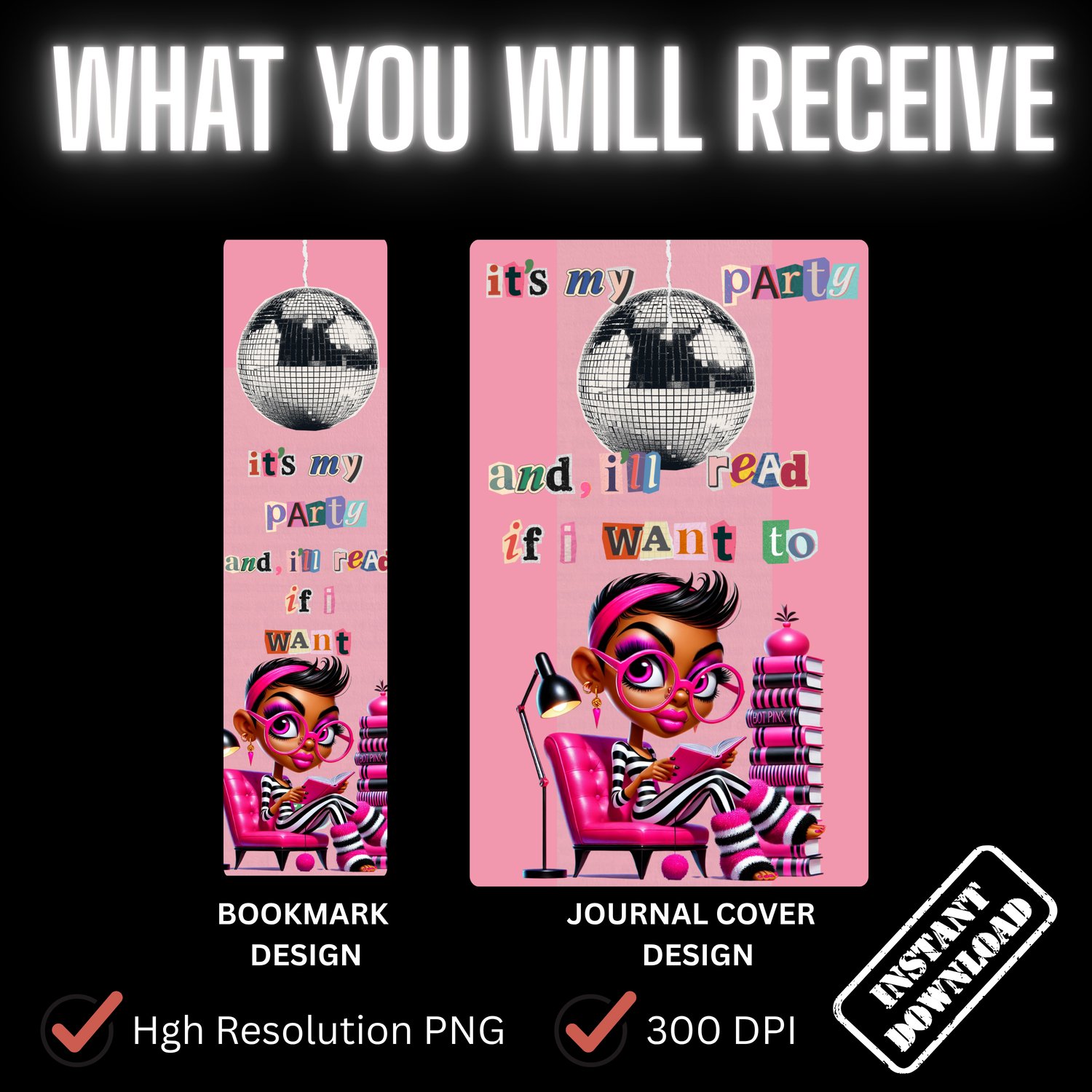 This It’s My Party & I’ll Read PNG Bundle includes a bold journal cover and matching bookmark design for readers who’d rather stay in and read.