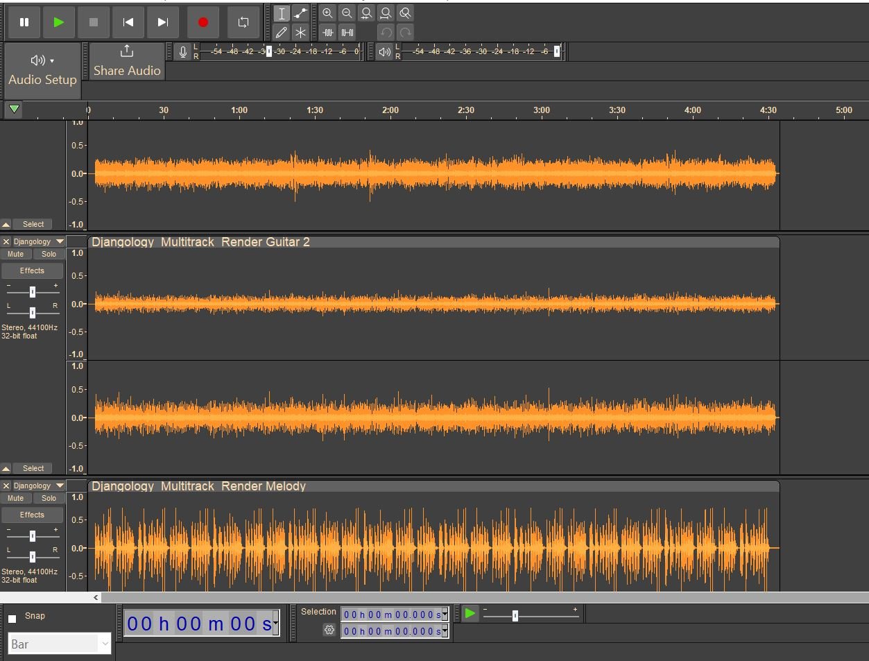 This multi-track audio file ( double bass, drums, rhythm guitar 1, rhythm guitar 2, melody guitar, solo guitar ) is a great aid in learning and mastering Django Reinhardt-style Gypsy Jazz music. Whether you want to learn guitar solos (melody, improvisation), rhythm guitar, double bass, drums, violin, accordion, etc., this will be a big help for you. For example, after you learn to play along with it, you can mute the track you are playing on your instrument. You can manage each track separately: mute, solo, lower, increase the volume, change the key, and more. The song is also included in PDF format (melody, chords, tablature). In the playback program (Audacity), you can set many things, change the language, choose the interface, etc.