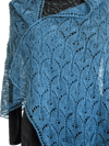 Shawl is knit on the bias, starting in one corner, and increasing on every right-side row. It is knit even through the body, then decreased to the point on the far end.