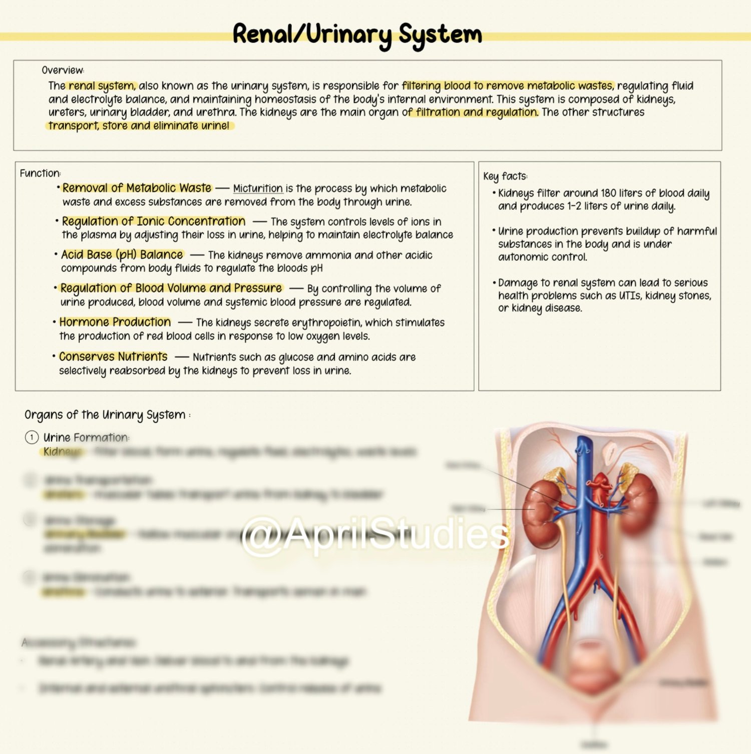 In depth and well organized notes covering the renal/urinary system designed for anatomy and physiology students and pre nursing students. These notes include: