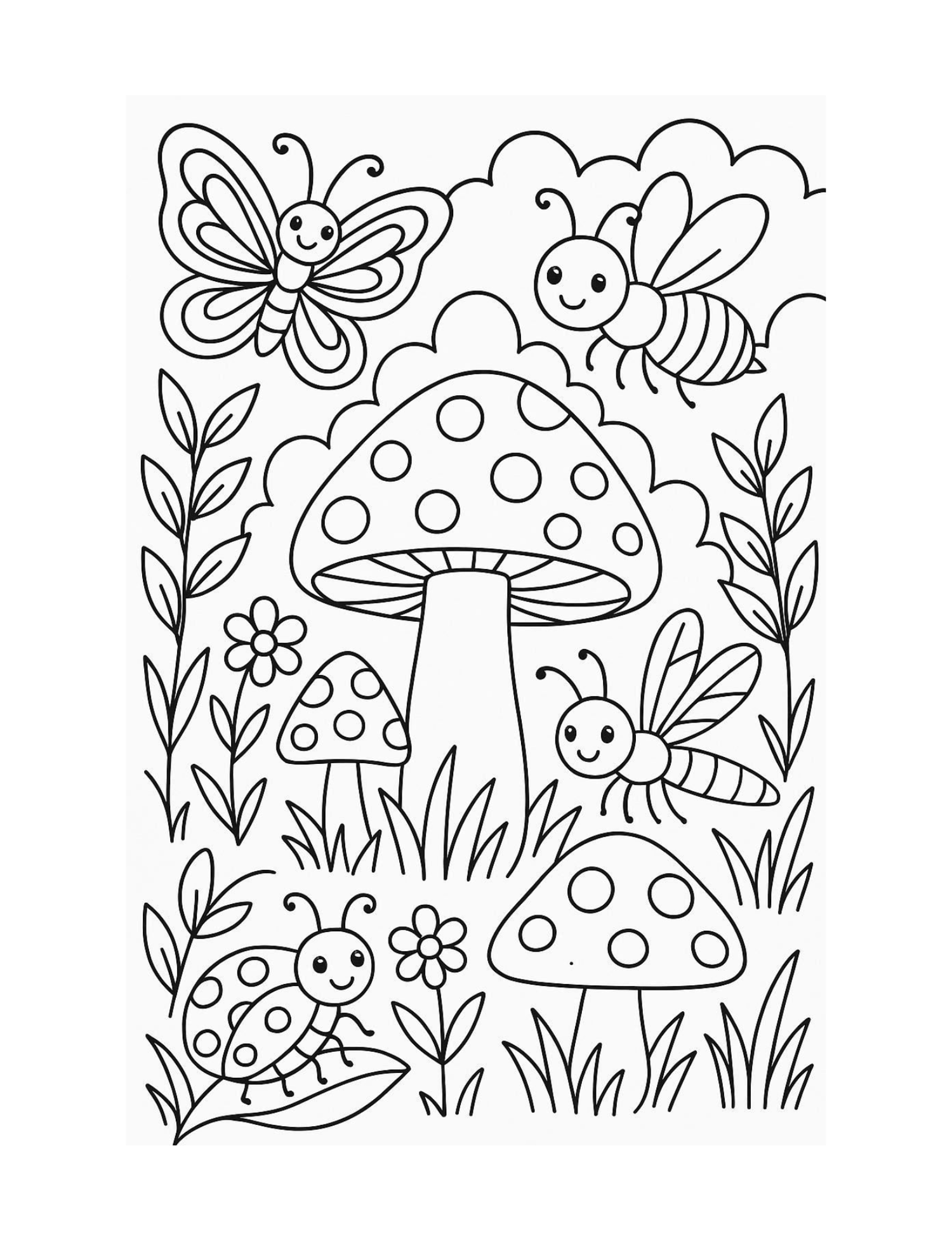 - Fun bug scenes like fireflies in jars, ant picnics, and whimsical mushrooms.