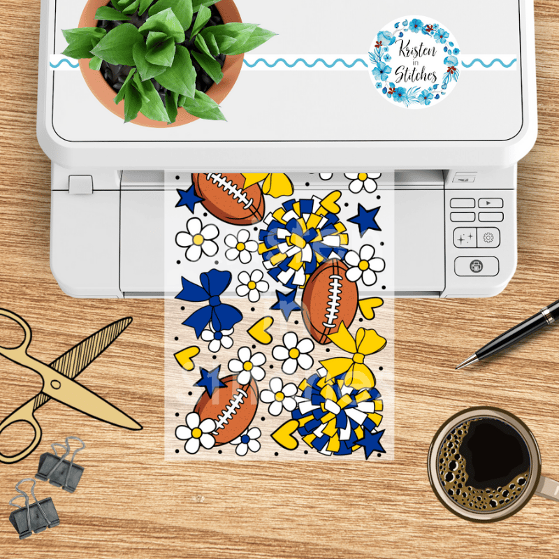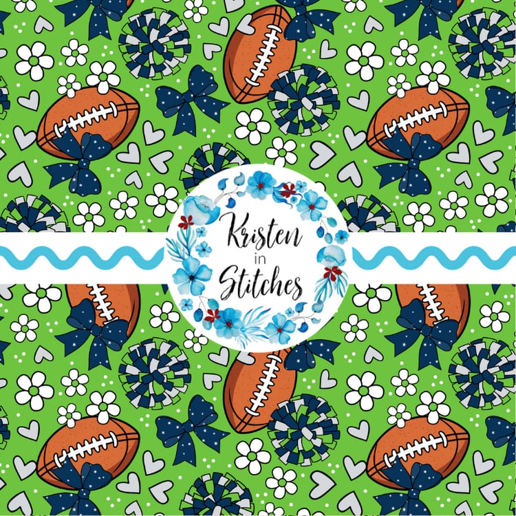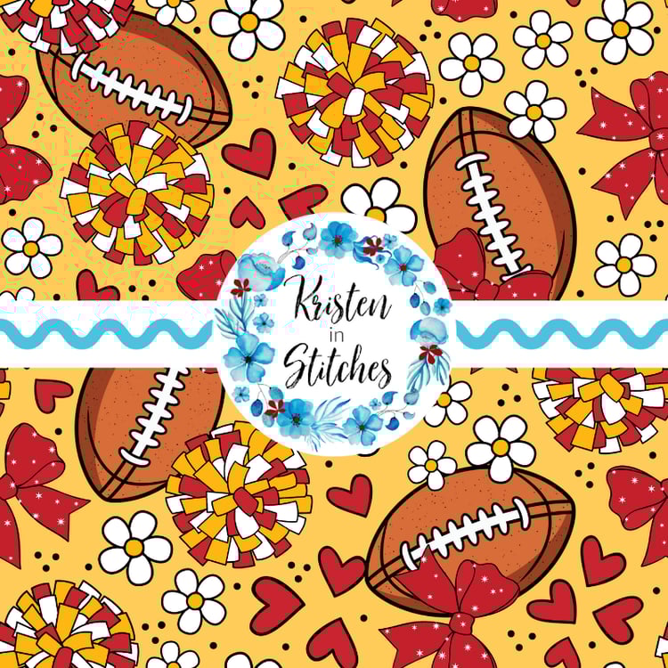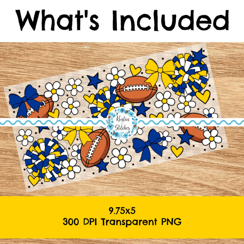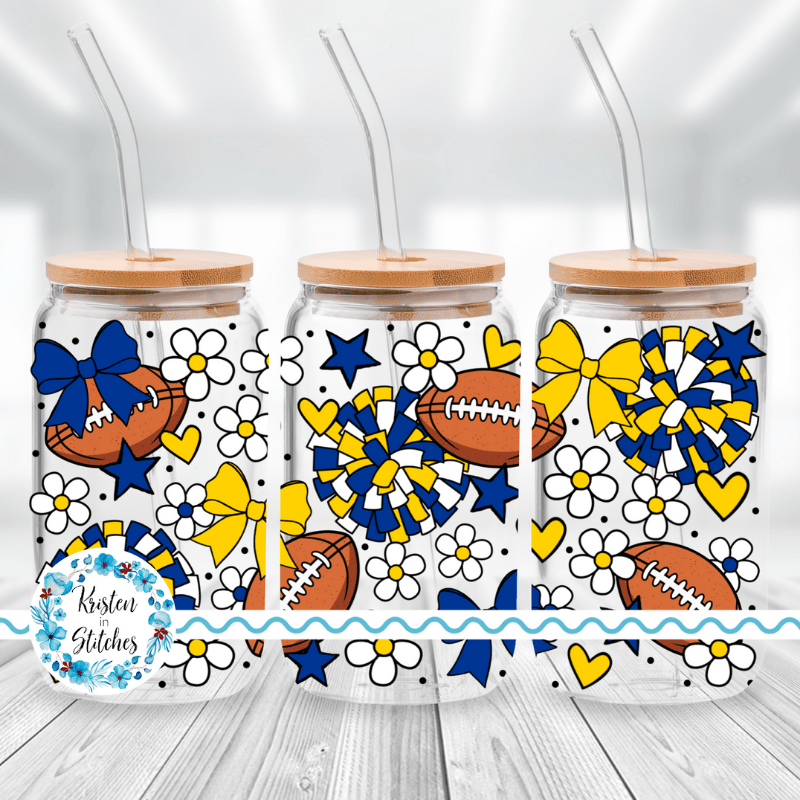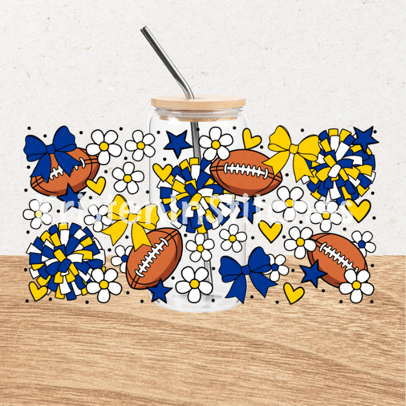 Features footballs and cheer bows in LA Rams blue and yellow.