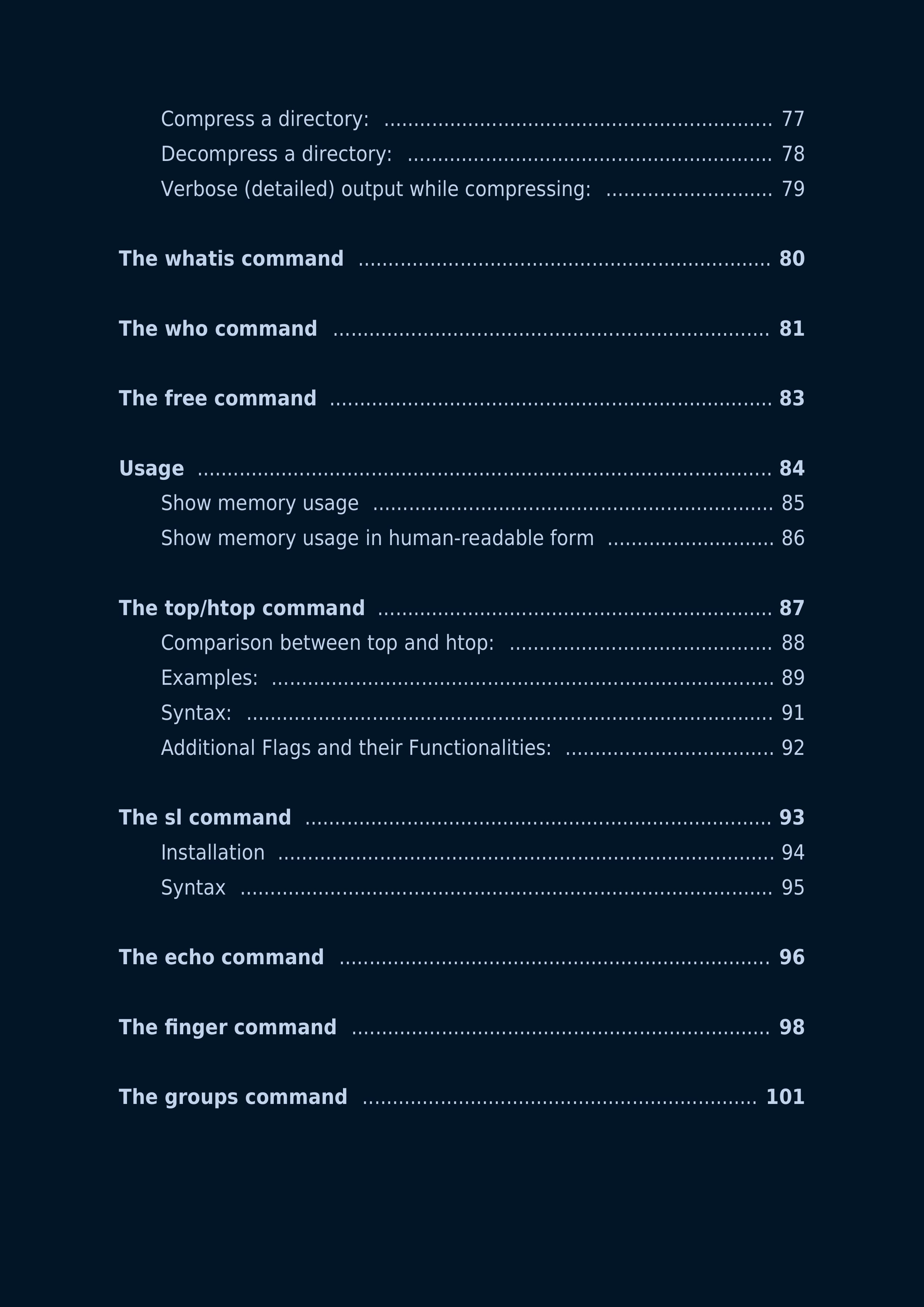 The guide is divided into several sections, each focusing on a specific aspect of Linux commands. It starts with the basics, including an introduction to the Linux terminal, file management, and process management. As you progress, the guide delves into more advanced topics such as networking, user management, package management, and shell scripting. Each command is explained in detail, with examples and practical use cases to help you grasp their functionality.