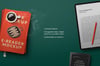 Photorealistic flat-lay mockup scene featuring a tablet inspired by iPad Pro, an e-reader, and a hardcover book, plus an Apple Pencil and a hot coffee cup. 7500 × 5500 px at 300 DPI.
