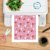 The pattern features friendly ghosts, skulls, bats and stars, ready for trick-or-treat! On a pink spiderweb background.