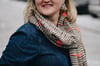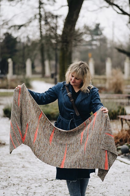 The wrap is knit flat from end to end. It is worked primarily in alternating 2-row stripes of Garter stitch. Thirteen inserts of a third accent color are shaped with short rows and give the shawl a slightly irregular shape.