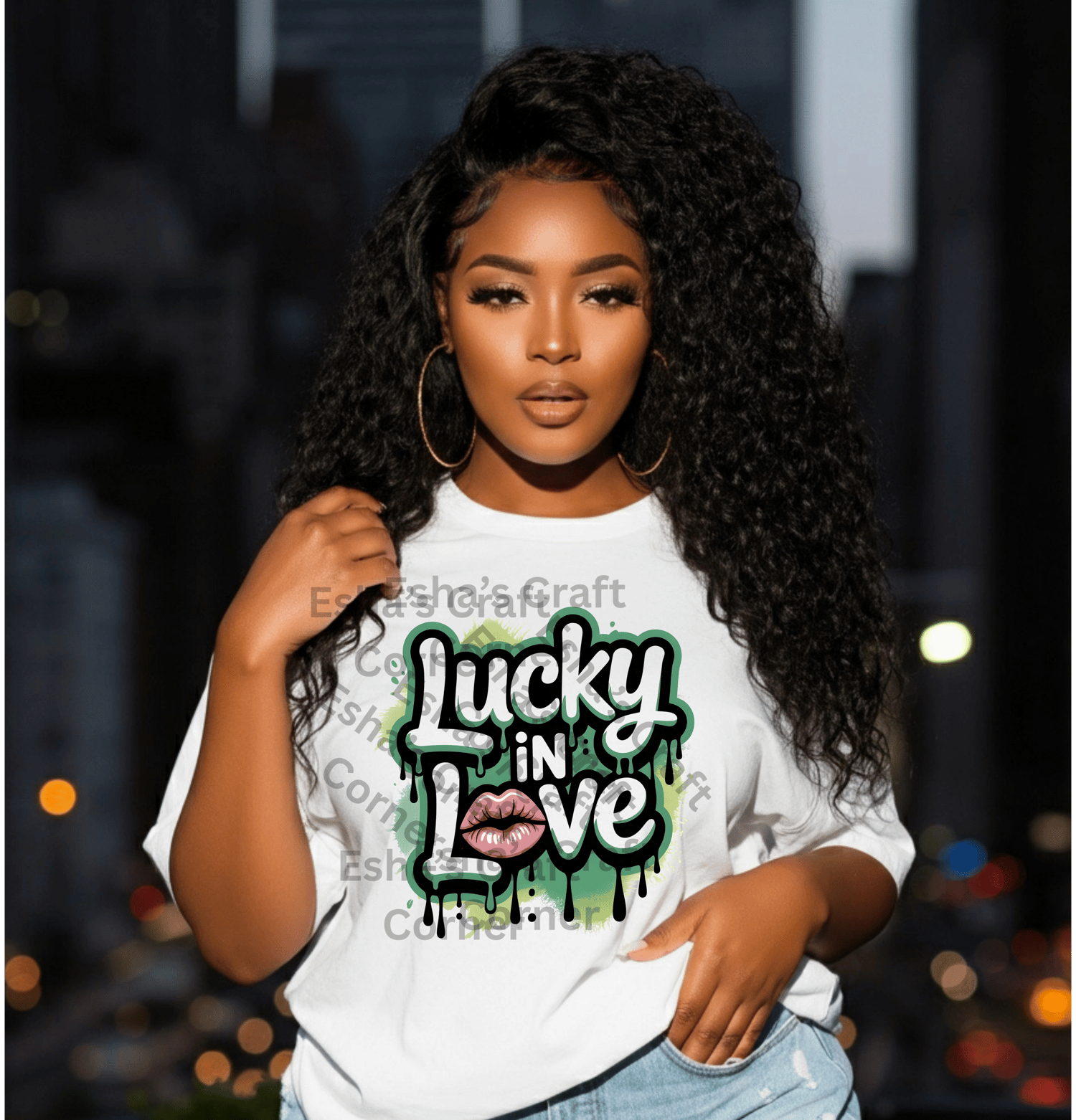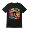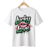 This Lucky In Love statement piece blends bold graffiti typography, glossy lip art, and urban drip effects for a street-style love aesthetic that turns heads.