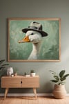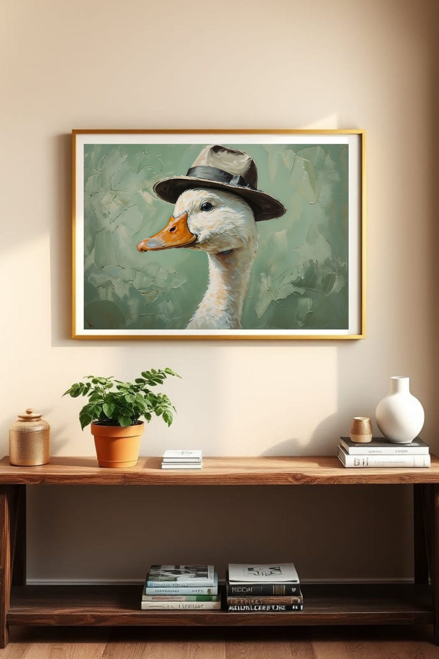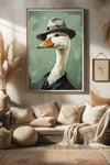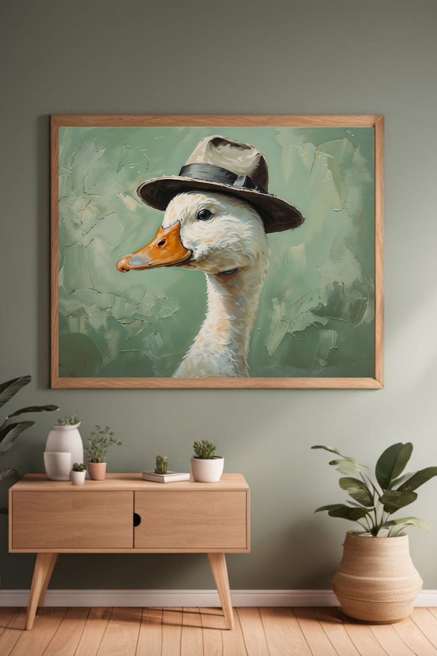 Add a dash of humor and sophistication to your space with this charming Duck Detective Wall Art! Featuring a stylish duck in a classic fedora and suit set against a soft sage green background, this printable artwork is ideal for anyone who loves quirky animal portraits, eclectic interiors, or conversation-starting wall decor.