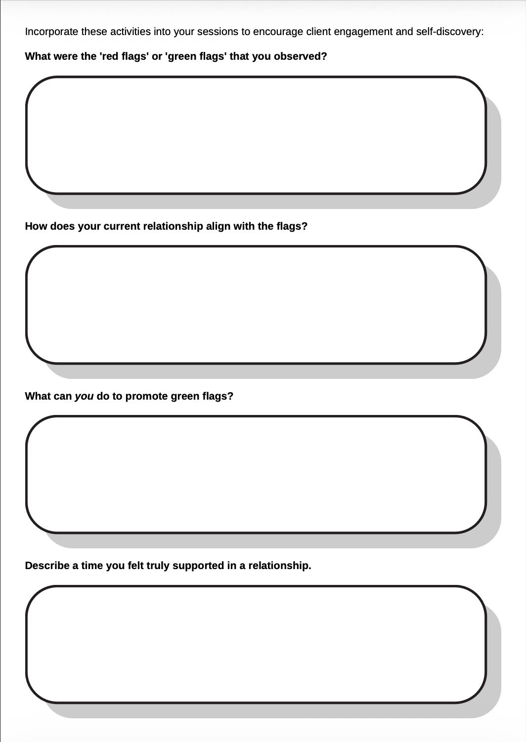 Designed for therapeutic use or personal reflection, this resource encourages insight without judgment. It supports clients in recognizing behavioral patterns, exploring beliefs about relationships, and strengthening their ability to make intentional, values-aligned decisions moving forward.