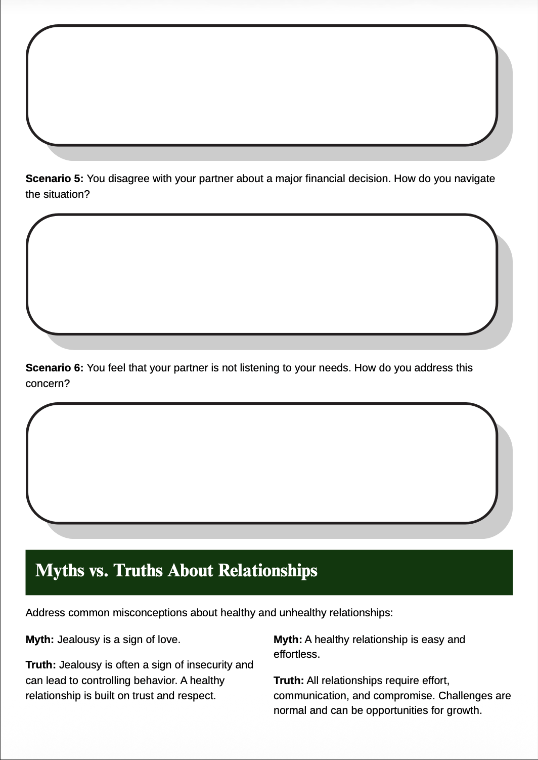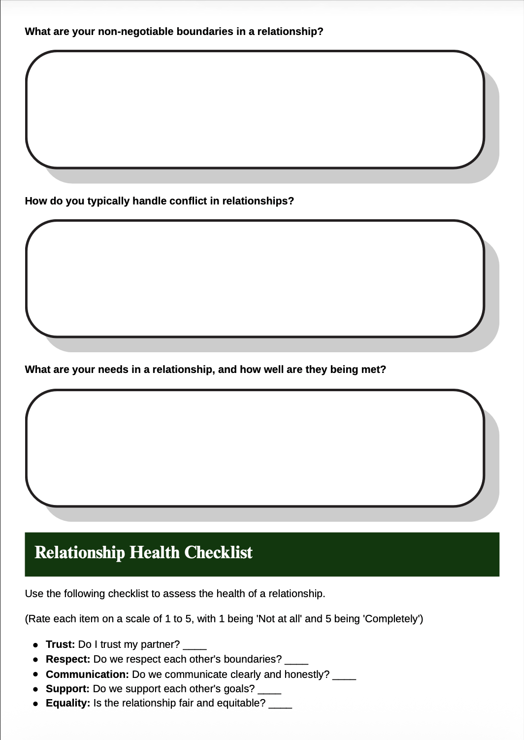 Guided questions encourage thoughtful exploration of personal experiences, expectations, and emotional needs.